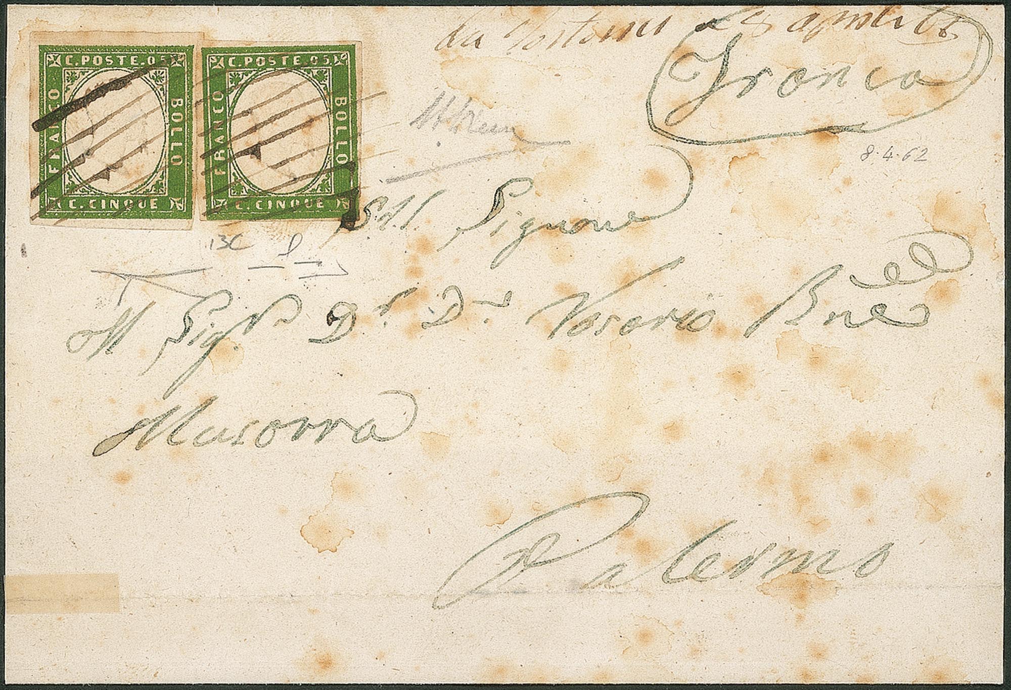 Antichi Stati Italiani - Sardegna - Lettera da Tortorici (a penna) per Palermo 8 aprile 1862Con 5 cent verde oliva (Sass. 13C) 2 esemplari annullati con tratti a penna obliqui (p. 13) PRIMA DATA USO di tale ufficio postale. Cert. Circostanziato A. Diena, Bottacchi e Manzoni