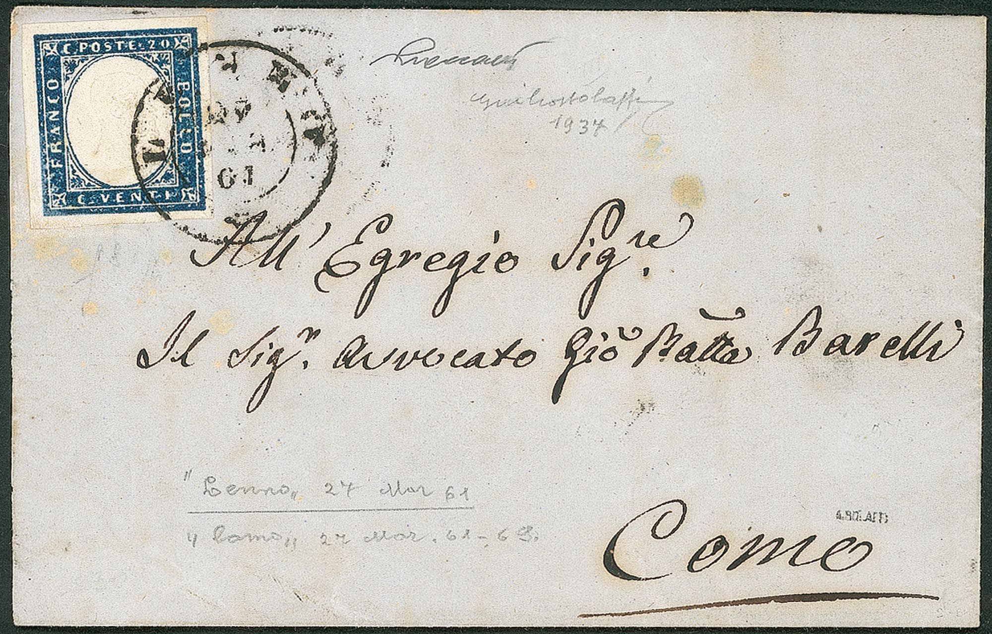 Antichi Stati Italiani - Sardegna - Da Lenno a Como il 27 marzo 1861 con 20 cent. (Sass. 15Ca)Annullato con doppio cerchio (p. 8)