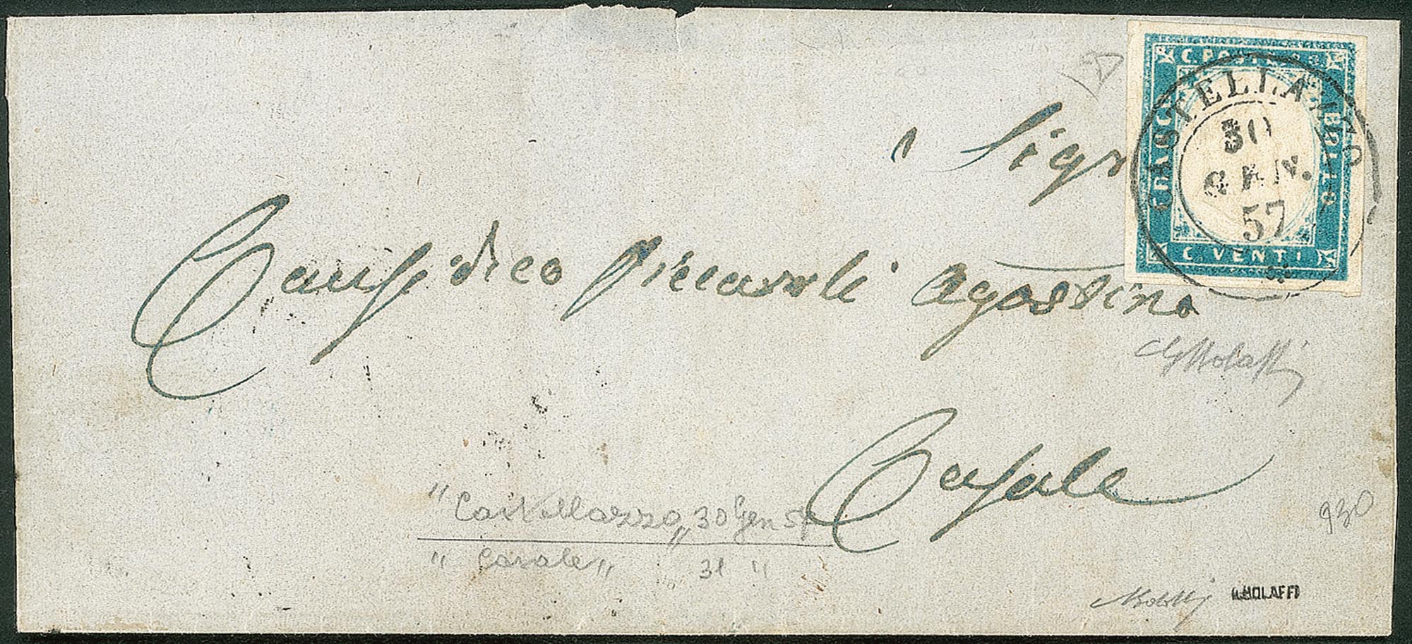 Antichi Stati Italiani - Sardegna - Annullamenti - Castellazzo (P.ti 5)Splendido esemplare del 20 cent cobalto con grandi margini (15) su bustina per Casale del 30.1.57 - cert. G. Bolaffi