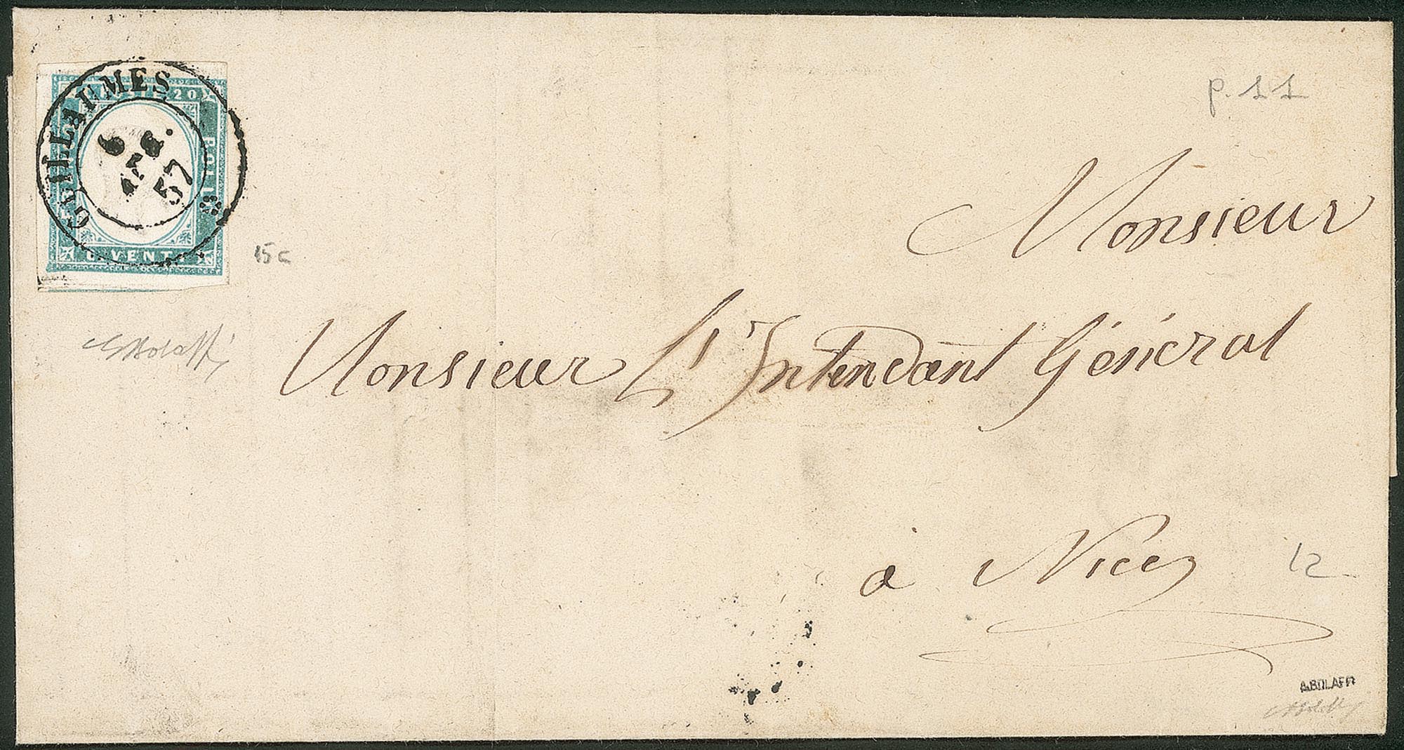 Antichi Stati Italiani - Sardegna - Annullamenti - Guillaumes (Nizza - P.ti 11)20 cent cobalto latteo chiaro (15c) su lettera per Nizza del 6.4.57 - molto bella - Bolaffi