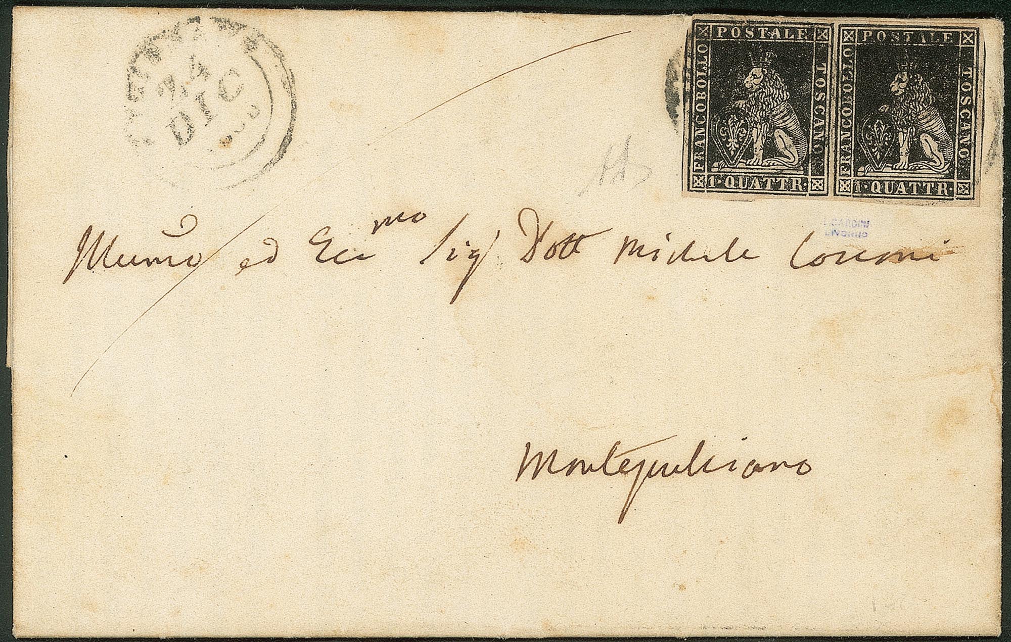 Antichi Stati Italiani - Toscana - Bellissima coppia del 1 quattrino nero (10)Con margini da buoni a ottimi su lettera stampata da Firenze a Montepulciano del 24.12.58 - molto bella e fresca - A. Diena