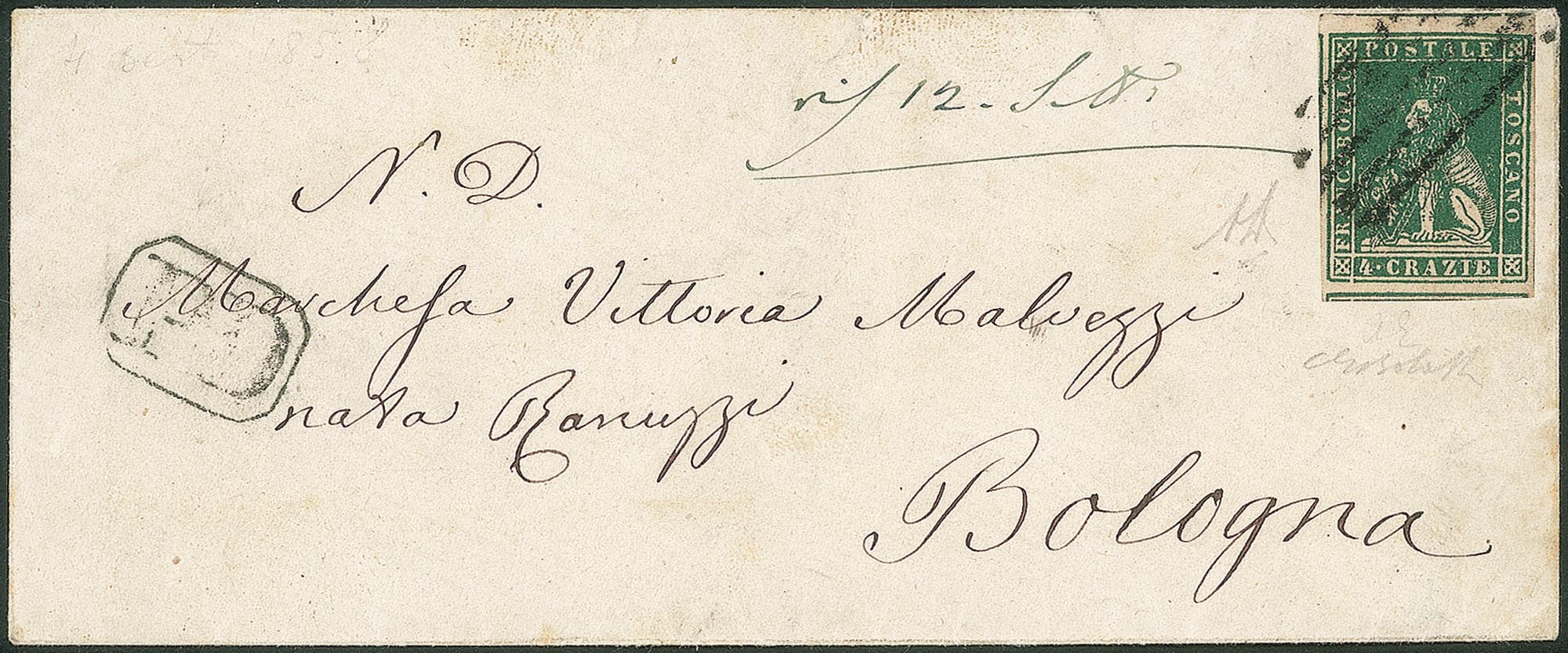 Antichi Stati Italiani - Toscana - Bellissimo esemplare con ampi margini del 4 crazie verde (14)Isolato su bustina per Bologna del 4.9.58 - annullo a 5 sbarre + PD in cartella - molto bella - A. Diena + G. Bolaffi