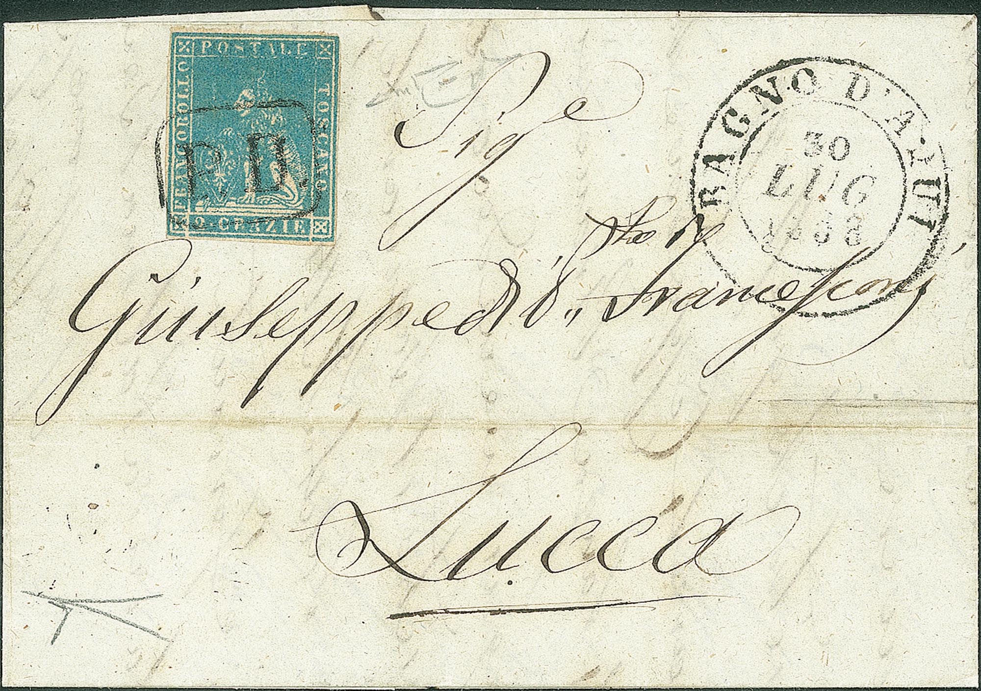 Antichi Stati Italiani - Toscana - Annullamenti - Bagno d'Aqui (doppio cerchio) + PD in cartella (P.ti 13)2 crazie (13) su lettera per Lucca del 30.7.58 - Raybaudi + cert. Bottacchi