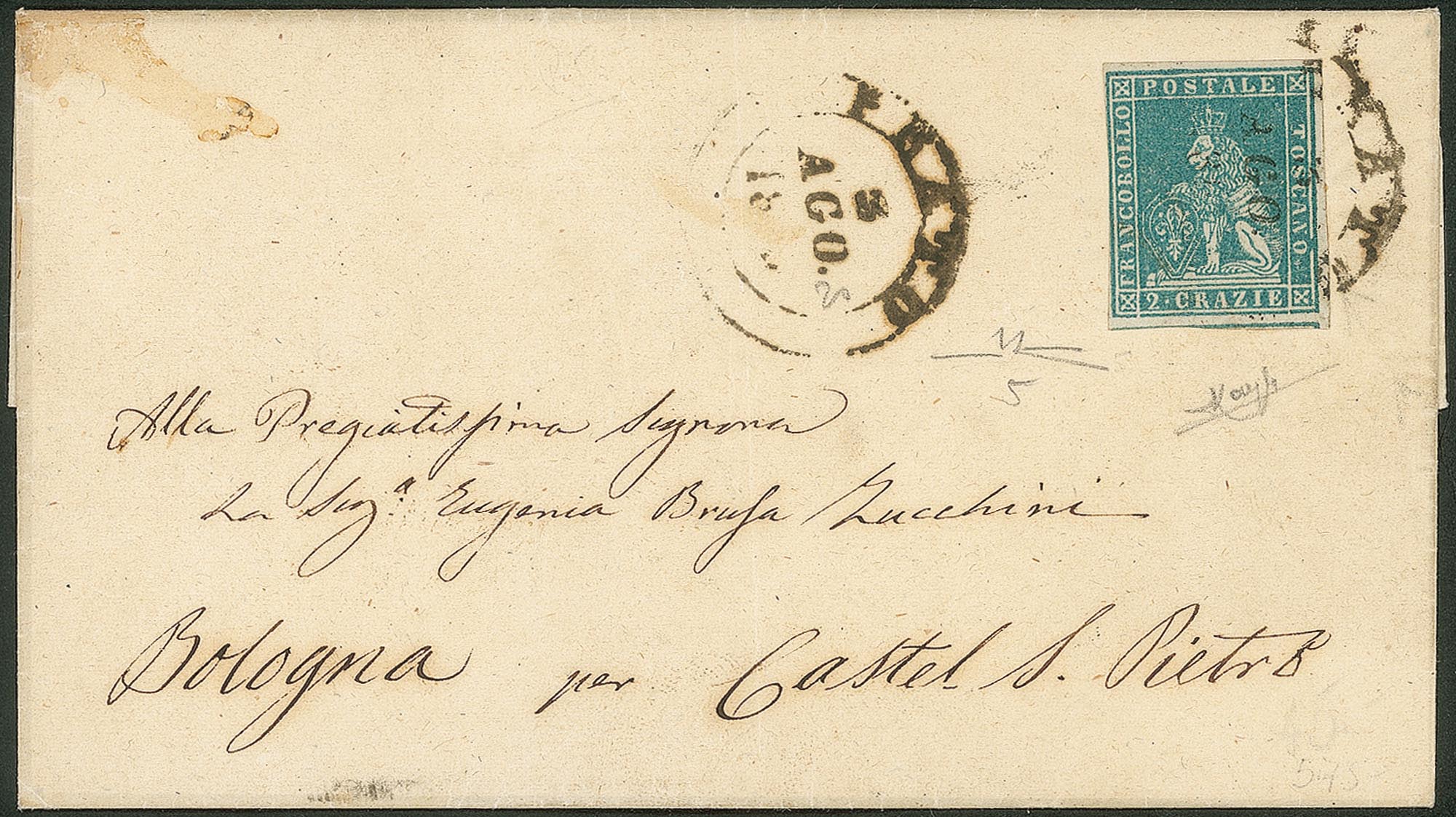 Lot 261 | Antichi Stati Italiani - Toscana - Annullamenti - Lettera gialla da Prato e Castel San Pietro del 3 agosto 1855