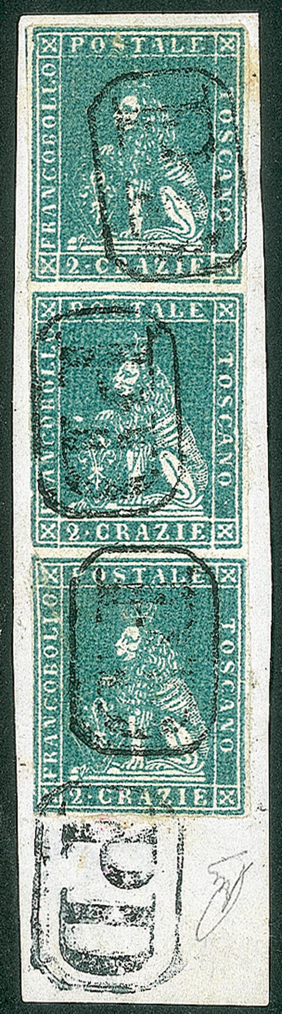 Antichi Stati Italiani - Toscana - Difetti di cliché - 1851 - Striscia verticale di tre del 2 crazie azzurro verdastro su grigio (5e)