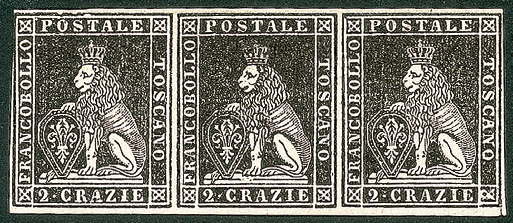 Lot 272 | Antichi Stati Italiani - Toscana - Difetti di cliché - 1851 - Prova - Striscia di tre del 2 crazie nero su carta bianca (P9)