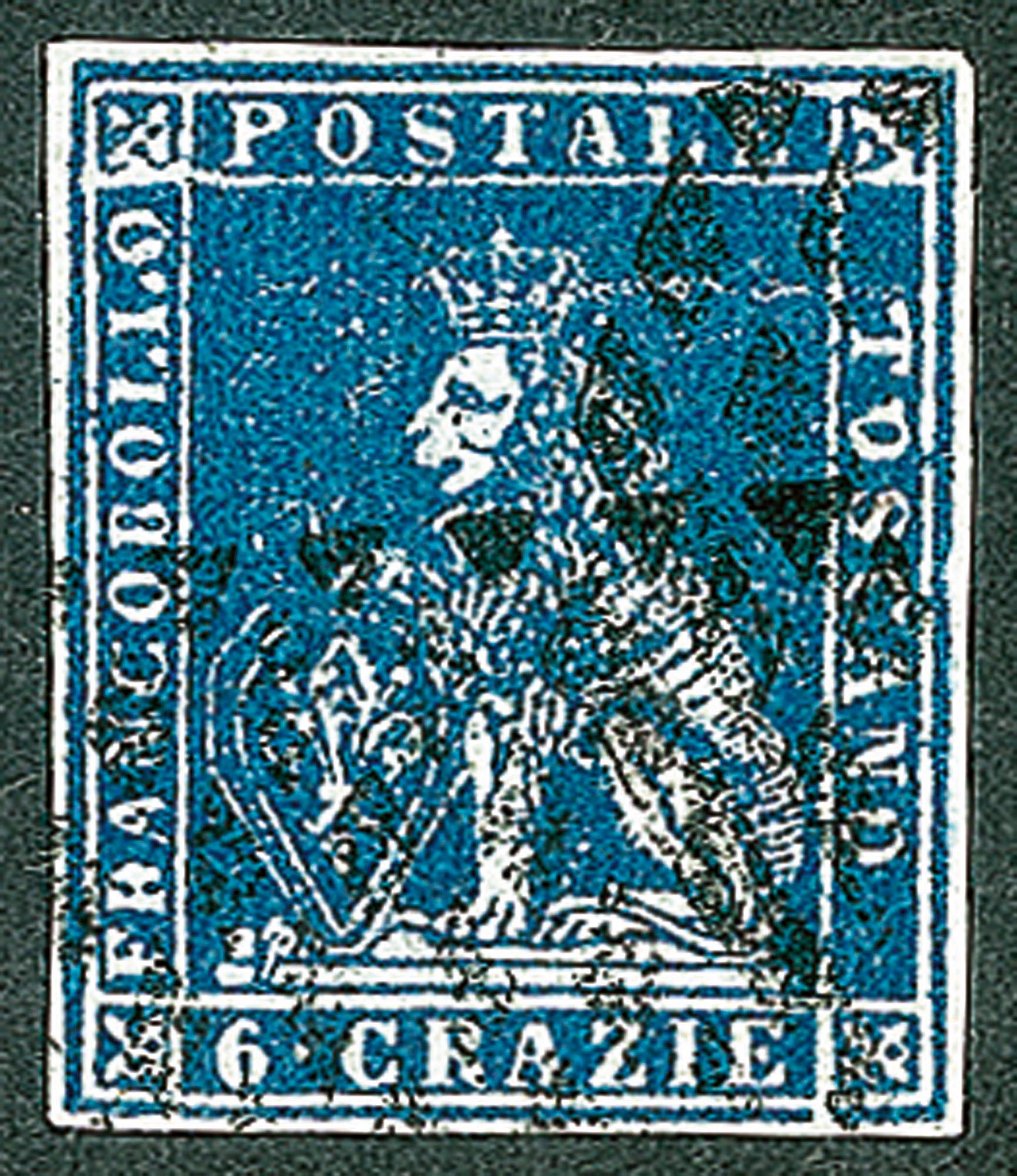 Antichi Stati Italiani - Toscana - Difetti di cliché - 1851 - Bell'esemplare del 6 crazie ardesia su grigio (7)Con evidente difetto su R di Francobollo su T di Toscano e sull'ornato superiore sinistro - usato - molto bello