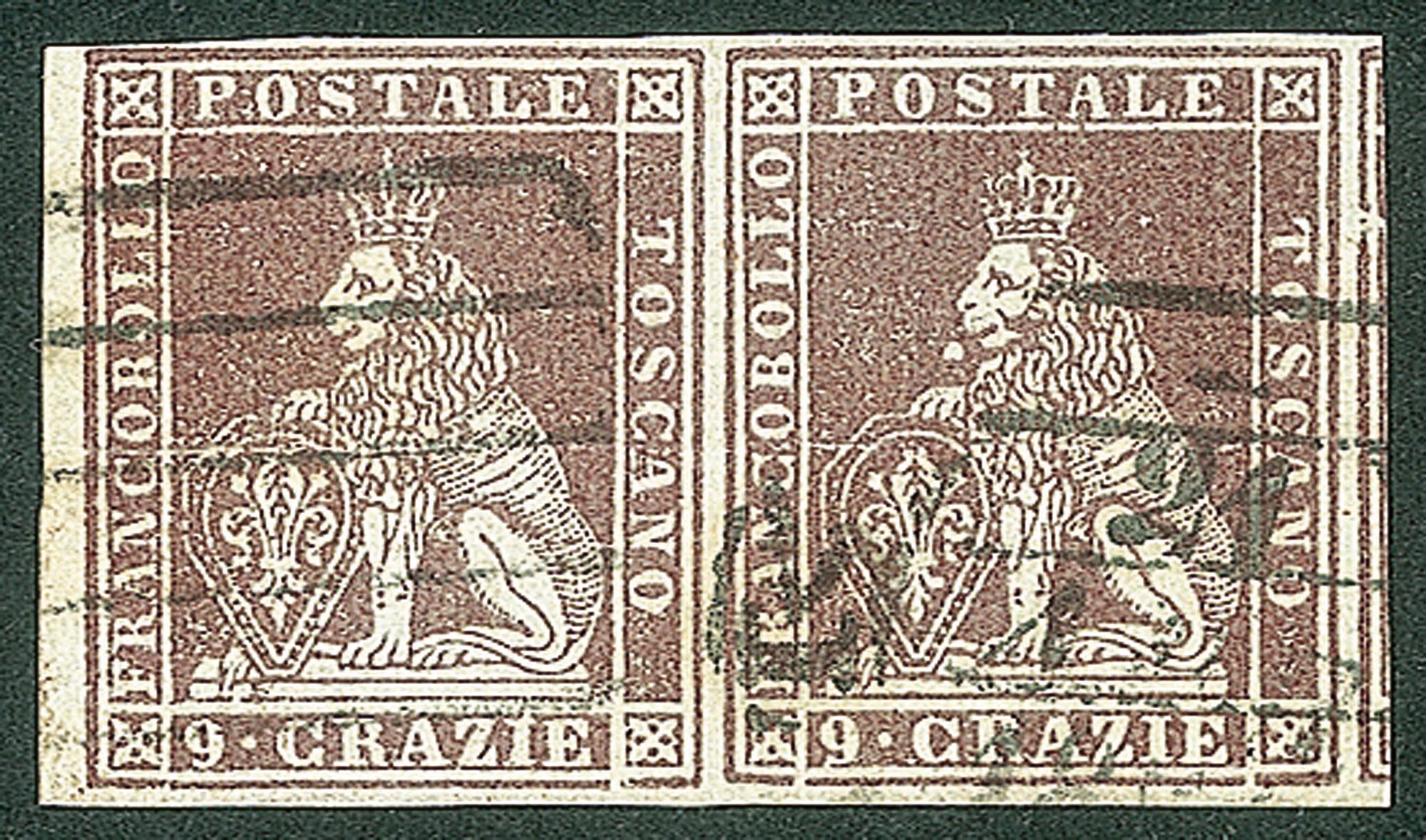 Lot 285 | Antichi Stati Italiani - Toscana - Difetti di cliché - 1851 - Bella coppia bordo di foglio del 9 crazie bruno violaceo