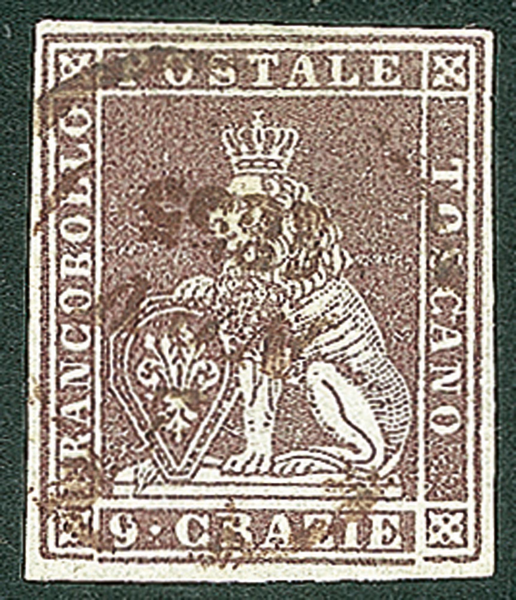 Antichi Stati Italiani - Toscana - Difetti di cliché - 1851 - Bellissimo esemplare con grandi margini del 9 crazie viola brunoSu grigio (8) con macchia sul corpo del leone - usato - cert. Biondi