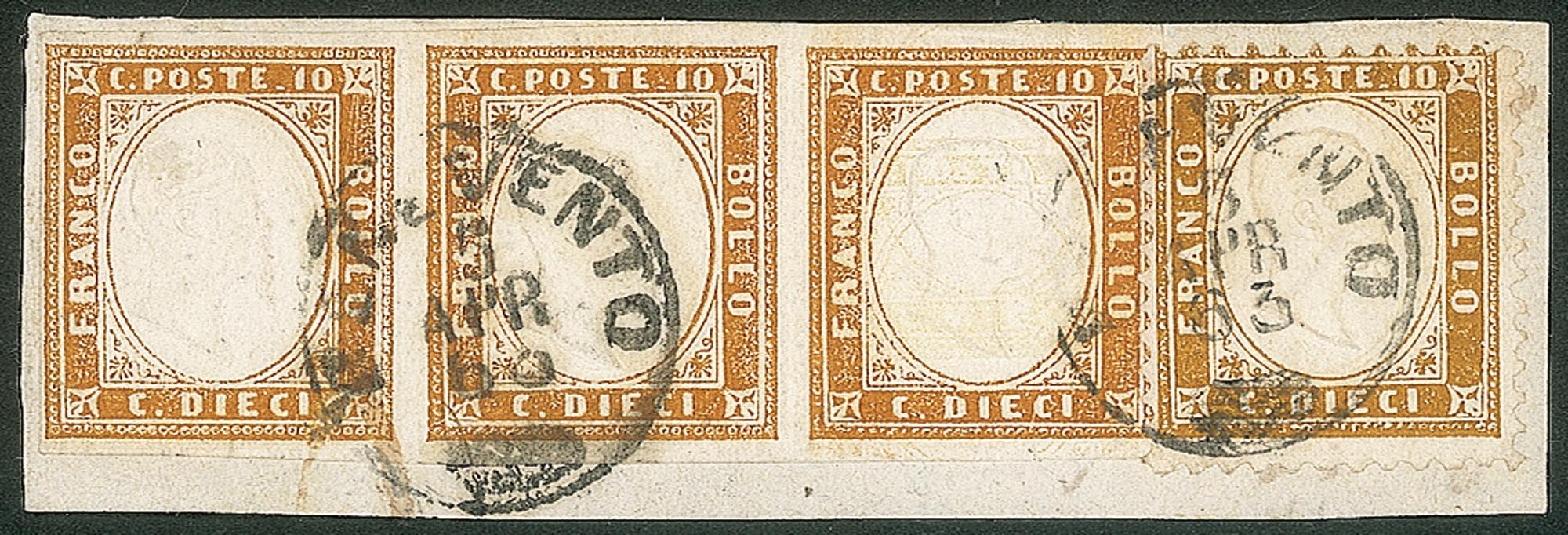 Regno - Vittorio Emanuele II - Frammento di lettera con splendida affrancatura mistaDi valori gemelli del 10 cent Sardegna/Regno (14E striscia di tre + 1f) annullati a Benevento 5.4.63 - splendida - cert. E. Diena
