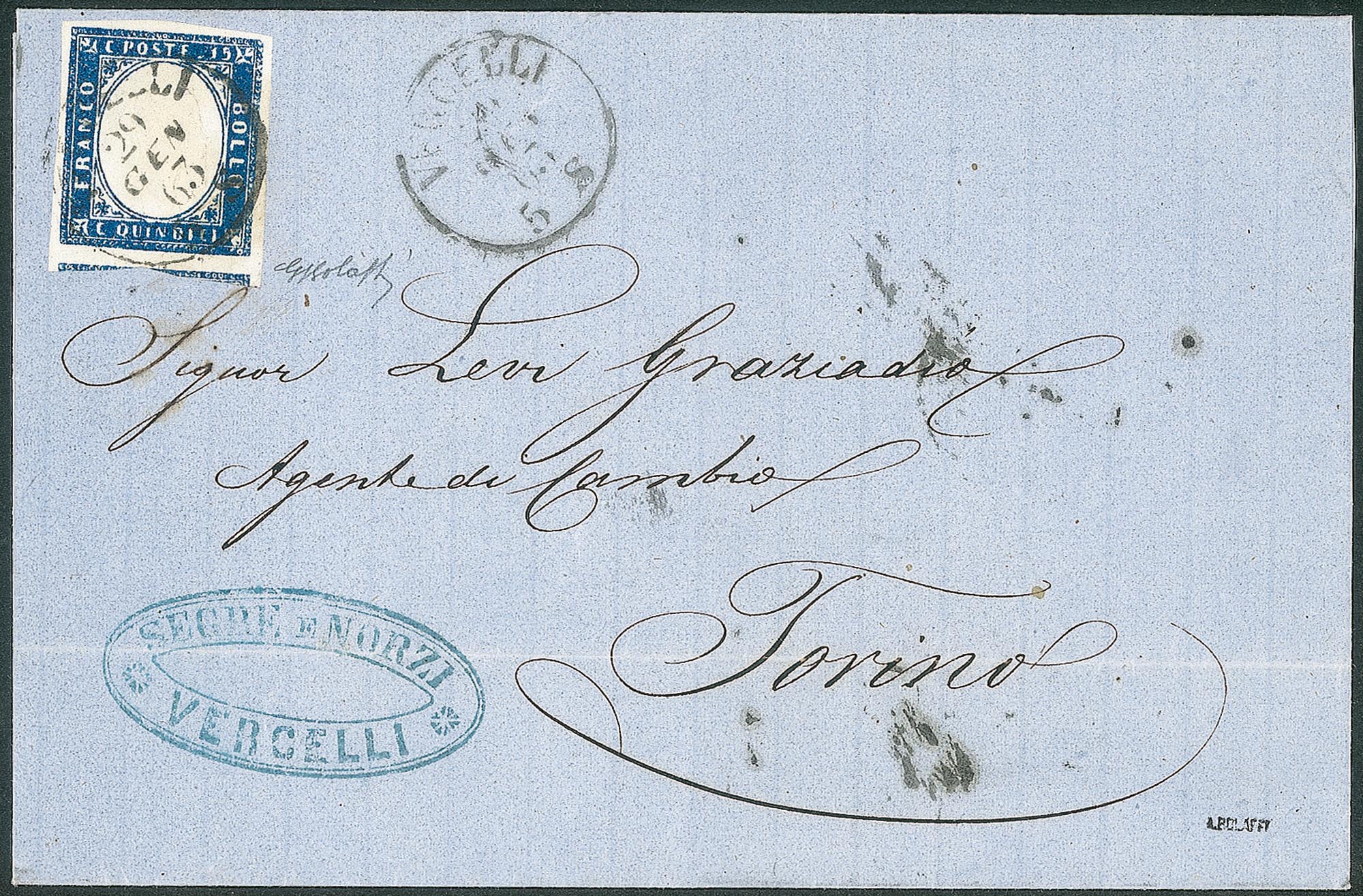 Regno - Vittorio Emanuele II - Splendido 15 cent azzurro vivo (11)Con ampi margini e parte dell'esemplare inferiore su lettera da Vercelli a Torino del 29.1.63 - molto bella - cert. Bolaffi