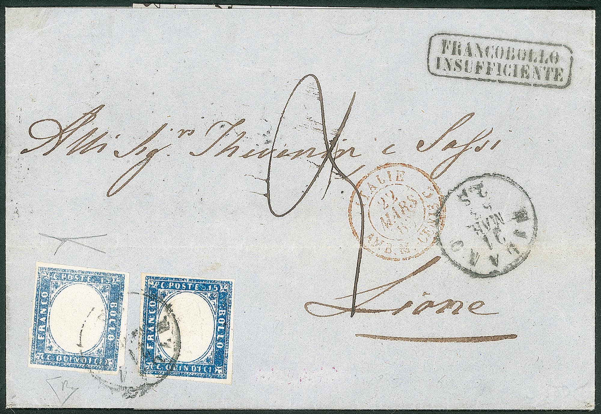 Regno - Vittorio Emanuele II - Lettera con cent. 15 azzurro ardesia chiaro + cent. 15 azzurro chiaro (11fa + 11a )Da Milano a Lione del 11.3.63 - valori gemelli con il raro ardesia chiaro - ex coll. Provera - Cert Bottacchi