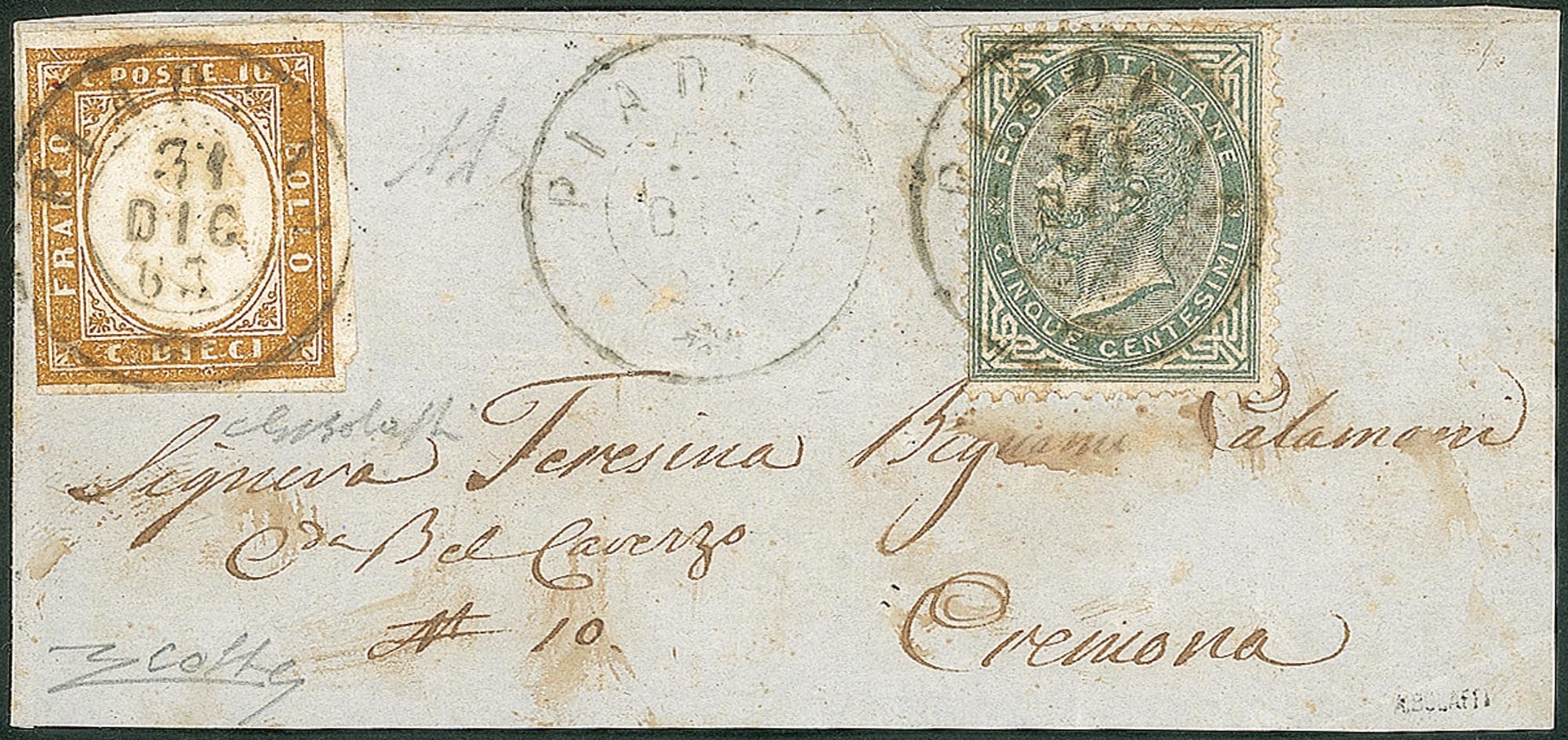 Regno - Vittorio Emanuele II - Fronte di lettera recante un 10 cent Sardegna + 5 cent DLR (14E + L16)Piadena 31.12.63 (ultimo giorno d'uso ufficiale dei francobolli sardi) - unica mista nota - firma Bolaffi + A. Diena + cert. Raybaudi + cert. Colla