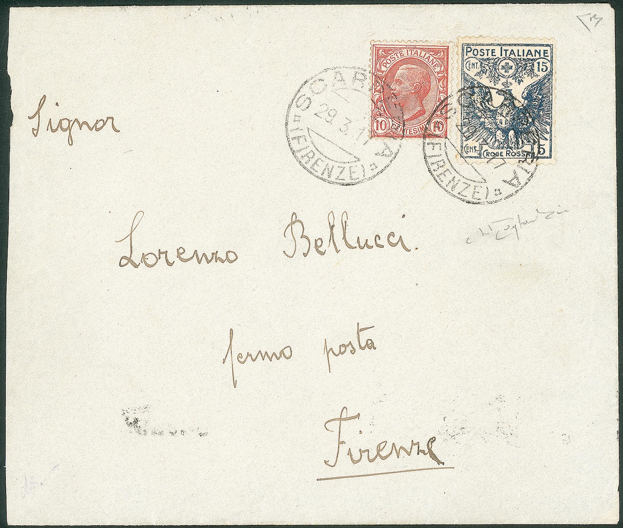 Regno - Vittorio Emanuele III - Busta viaggiata da Scarperia 29.3.17Per Firenze affrancata con 10 cent Leoni più Falso dell'epoca del 15 + 5 cent Pro Croce Rossa (82 + F103) - pezzo probabilmente unico - cert. Raybaudi + E. Diena