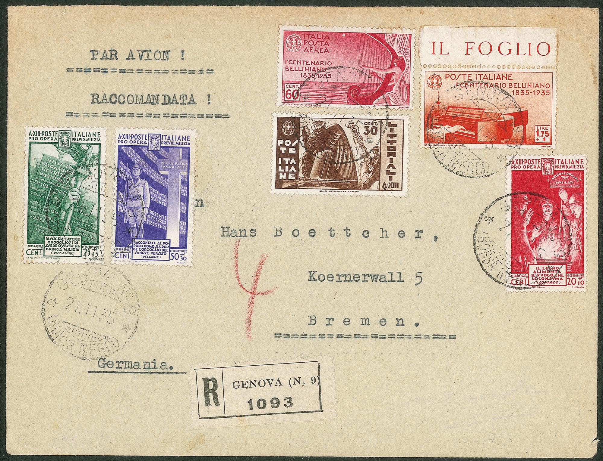 Regno - Vittorio Emanuele III - Milizia 4° emissione 20 + 10 cent 25 + 15 cent e 50 + 30 cent (380/382)+ Bellini e Littorali (392 + 92 + 378) su aerogramma raccomandato da Genova a Bremen del 21.11.35 - non comune