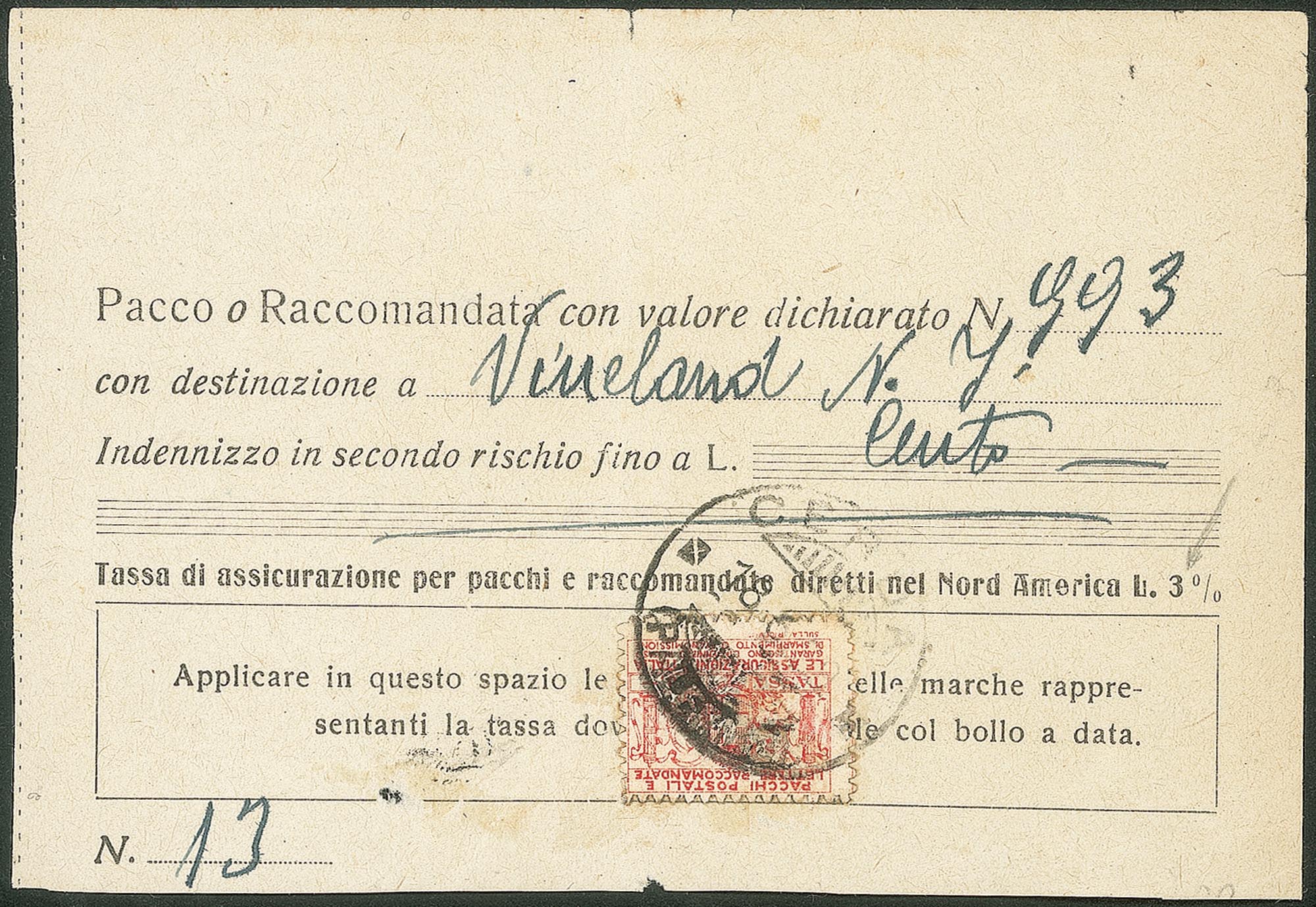 Regno - Vittorio Emanuele III - Servizi - 3 lire Assicurativo (6)Parte sinistra su ricevuta di pacco - Cerda 18.6.29 - molto raro