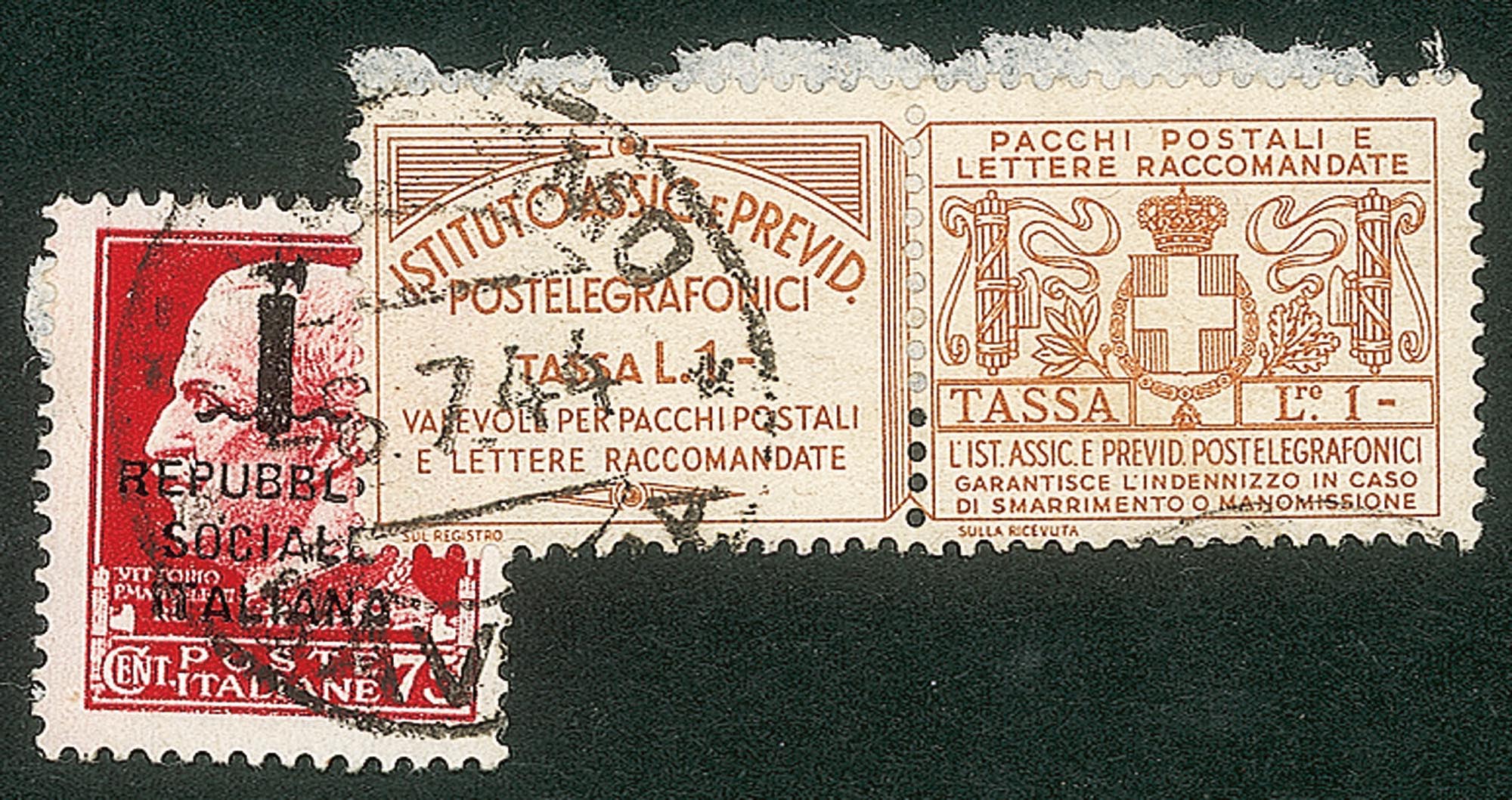 Repubblica Sociale - Provvisori - Frammento d'affrancatura d'emergenza composta da 75 cent (494)+ Francobollo Assicurativo da 1 lira (13) - Millesimo (Savona) 6.7.44 - uno dei due casi usati citati dal Sassone - molto raro - cert. Andreoni + cert. oro Raybaudi