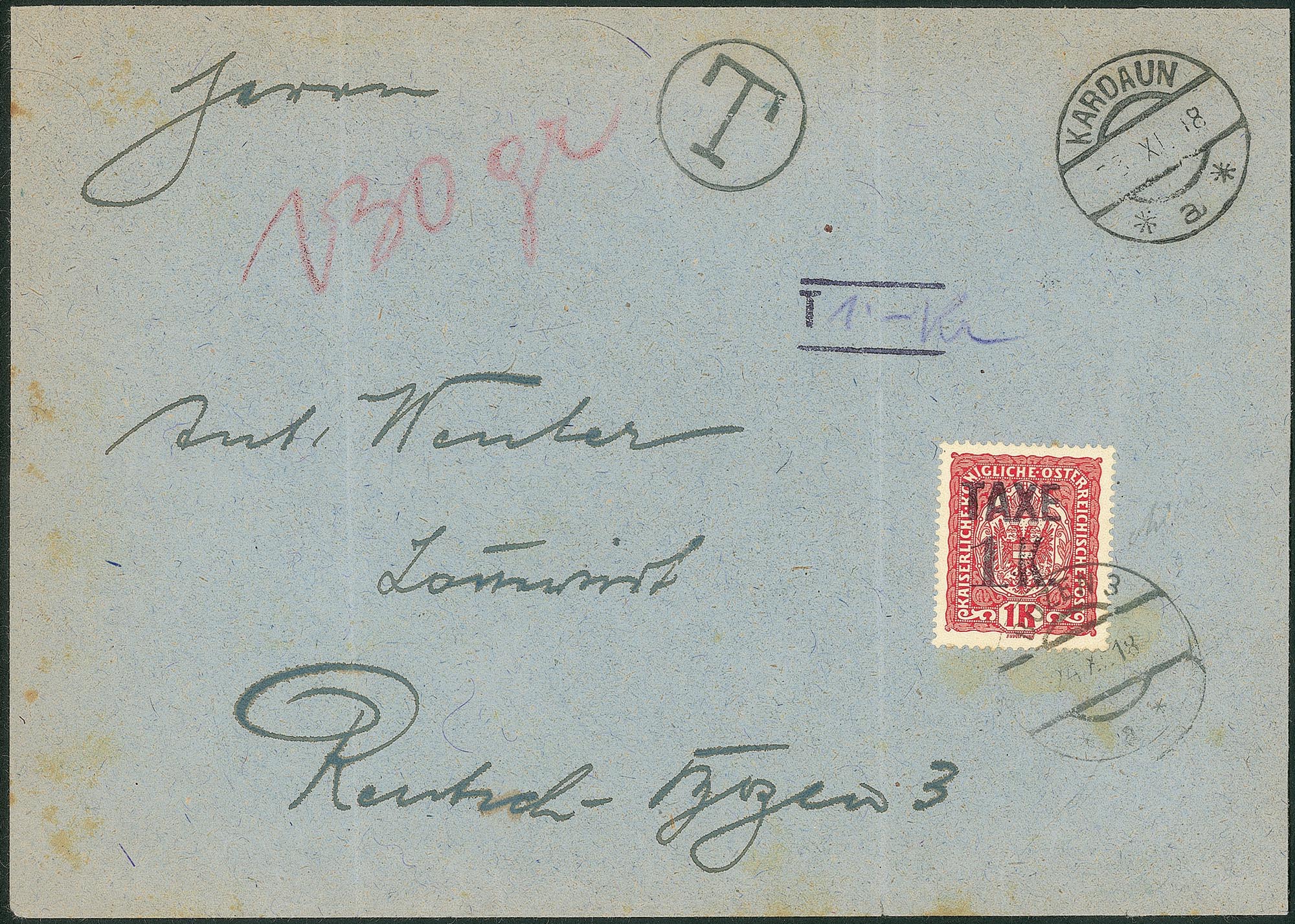 Occupazioni I guerra mondiale - Trentino-Alto Adige - Busta da Kardaun 23.11.18 tassata con 1 su 1 k. (BZ3/74)