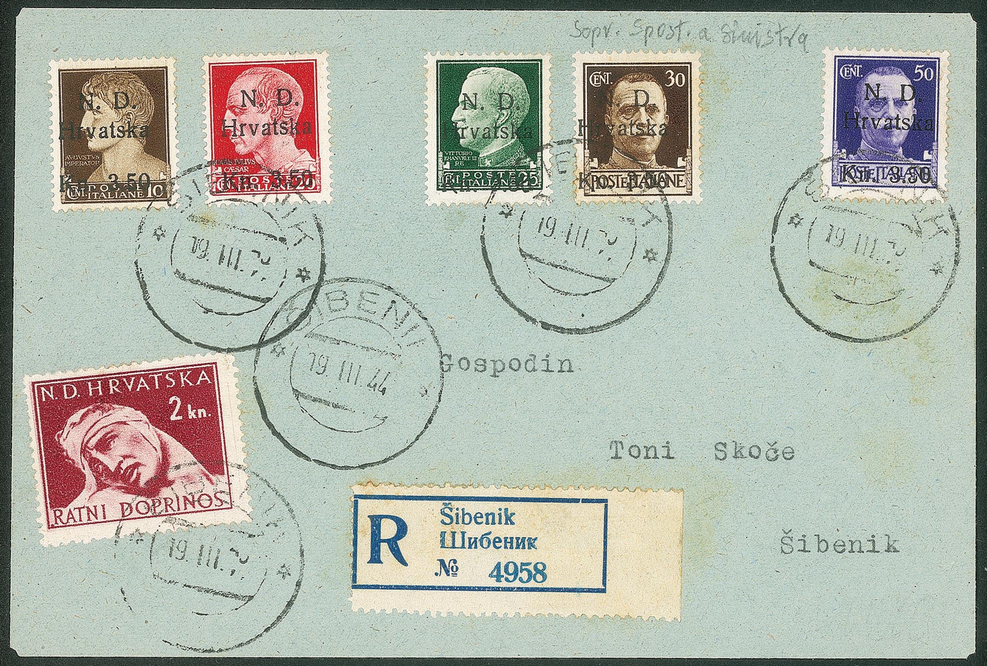 Occupazioni II guerra mondiale - Occuopazione Croata - Sebenico - Sebenico - I cinque valori soprastampati (1/5)+ Valore Croato da 2 kn su busta raccomandata per città - Sebenico 19.3.44 - non comune