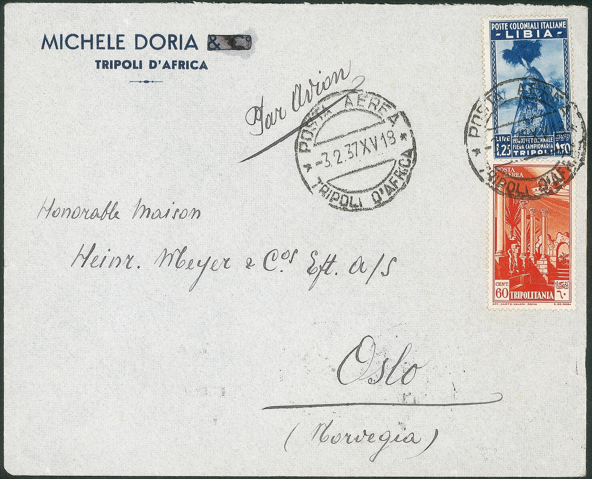 Su aerogramma da Tripoli a Oslo (Norvegia) del 3.2.37 - rara destinazione