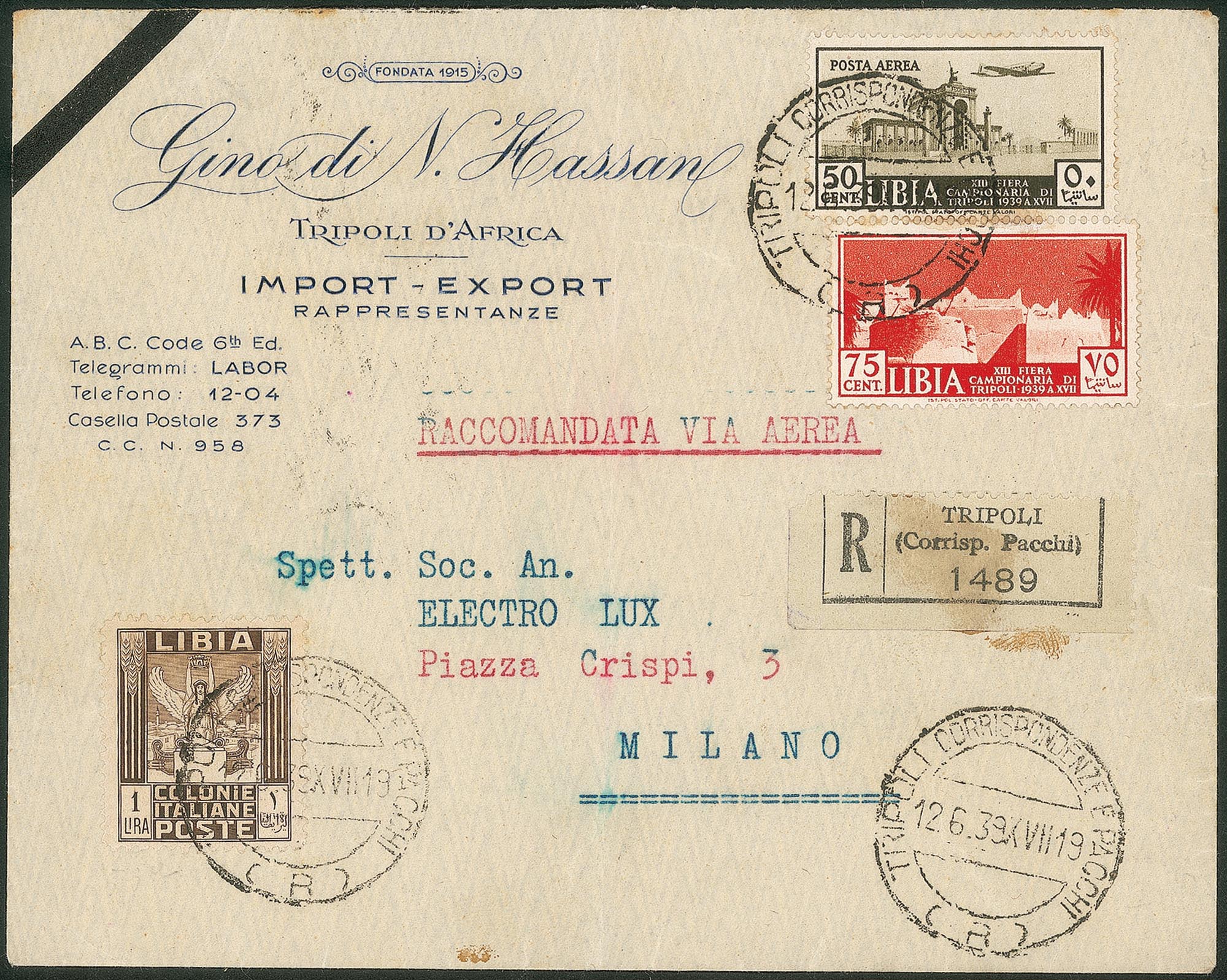 Colonie - Libia - XIII Fiera Campionaria 50 cent Aerea e 75 cent (161 + 39) + Pittorica 1 lira (53)Su aerogramma raccomandato da Tripoli a Milano del 12.6.39 - in tariffa