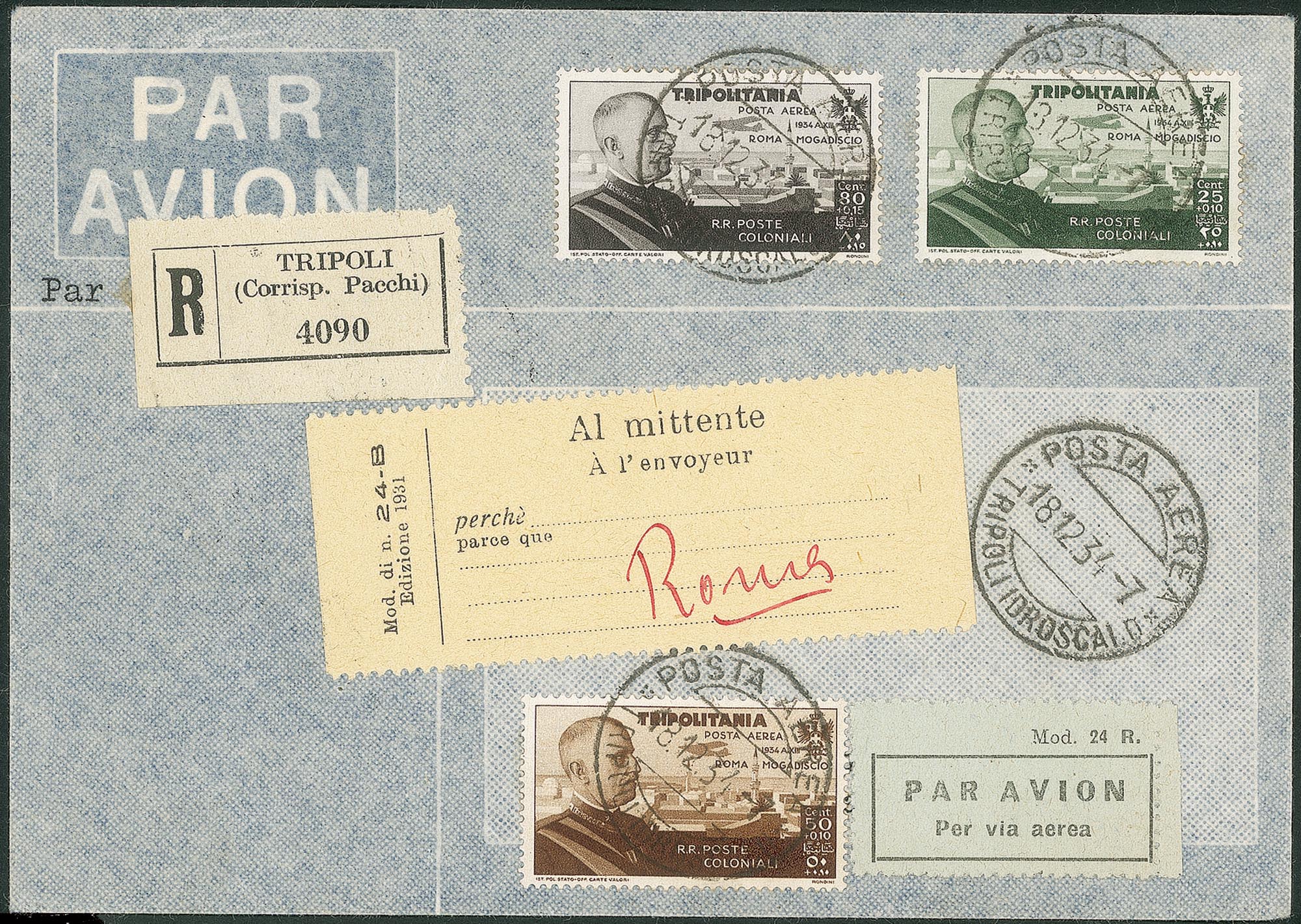 Colonie - Tripolitania - Roma Mogadiscio 25 cent + 50 cent + 80 cent (47/48+50) su aerogramma raccomandato da Tripoli a Agedabia del 18.12.34Con applicato sull'indirizzo tagliando Mod. 24-B delle poste - busta in tariffa - raro utilizzo di questi valori - splendida