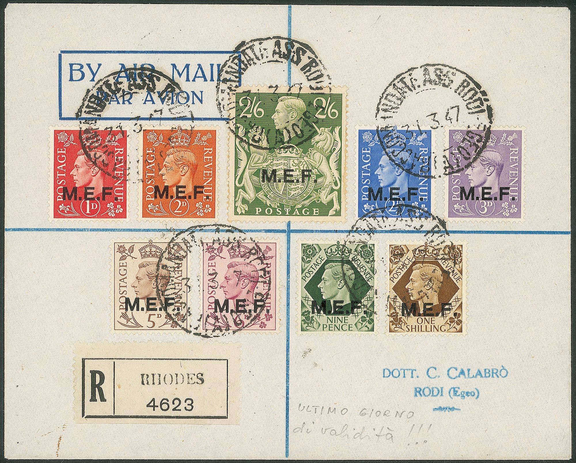 Occupazioni straniere delle colonie - Occupazione Britannica - M.E.F. - Raccomandata affrancata con 9 valori soprastampati MEF (6/14)Da Rodi il 31.3.47 nell'ultimo giorno di validità postale - molto bella