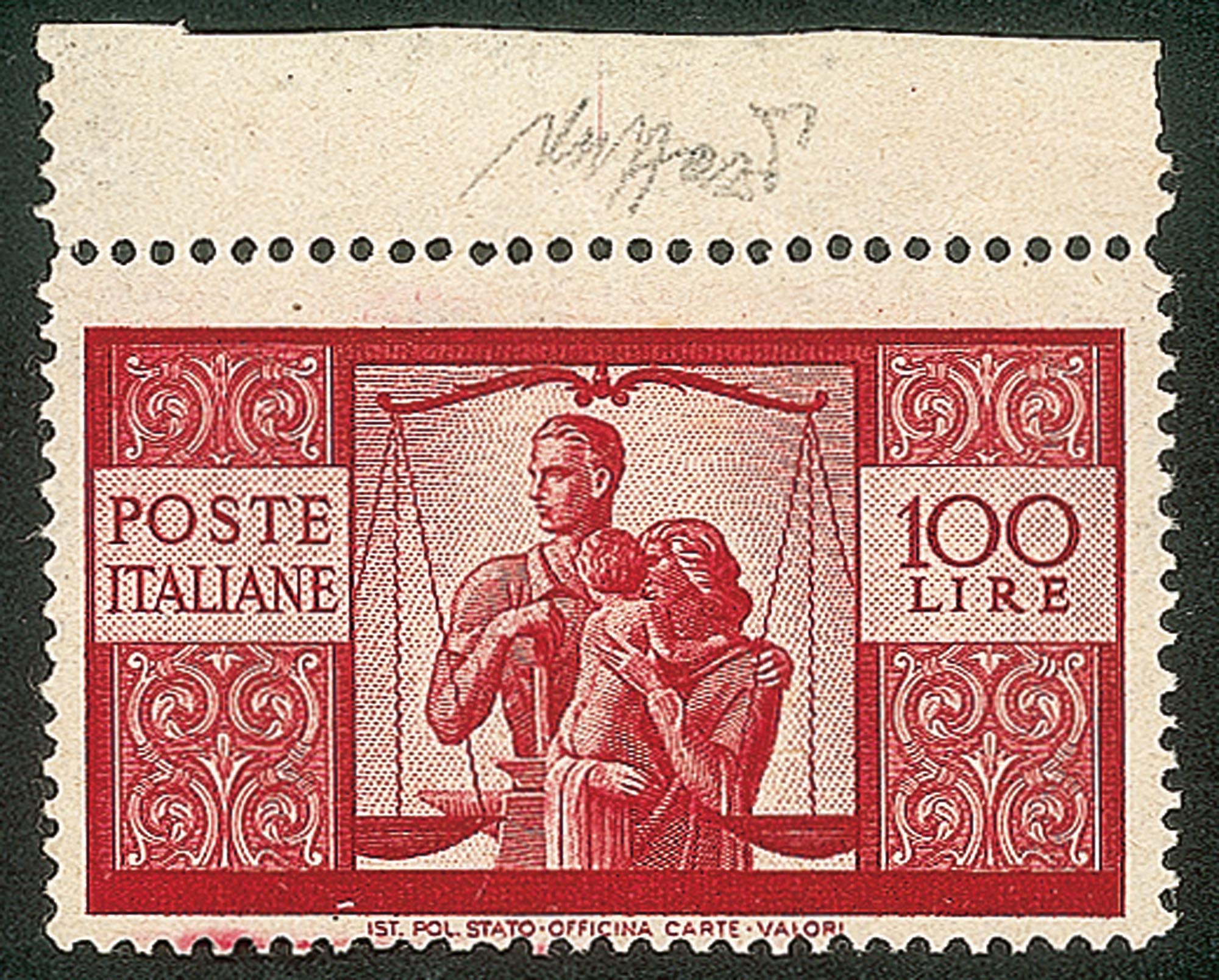 Italia - Repubblica - 1946 - Esemplare bordo foglio del 100 lire Democratica (565z)Con decalco - gomma integra - cert. Caffaz