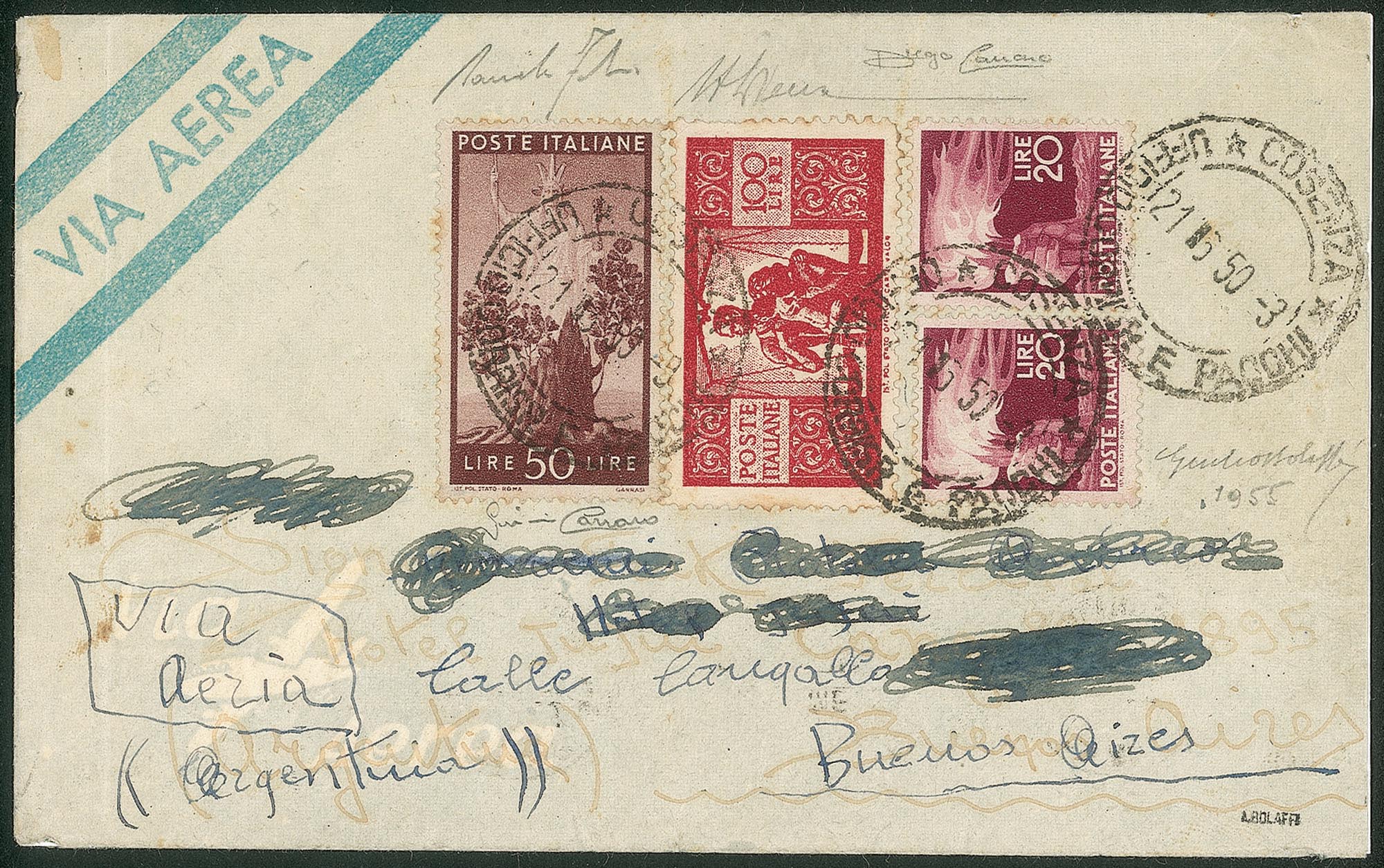 + complementari (due 561 + 564) da Cosenza a Buenos Aires del 21.5.50 - molto rara e di pregio - cert. A. Diena + cert. G. Bolaffi + cert. Carraro + cert. Fabris