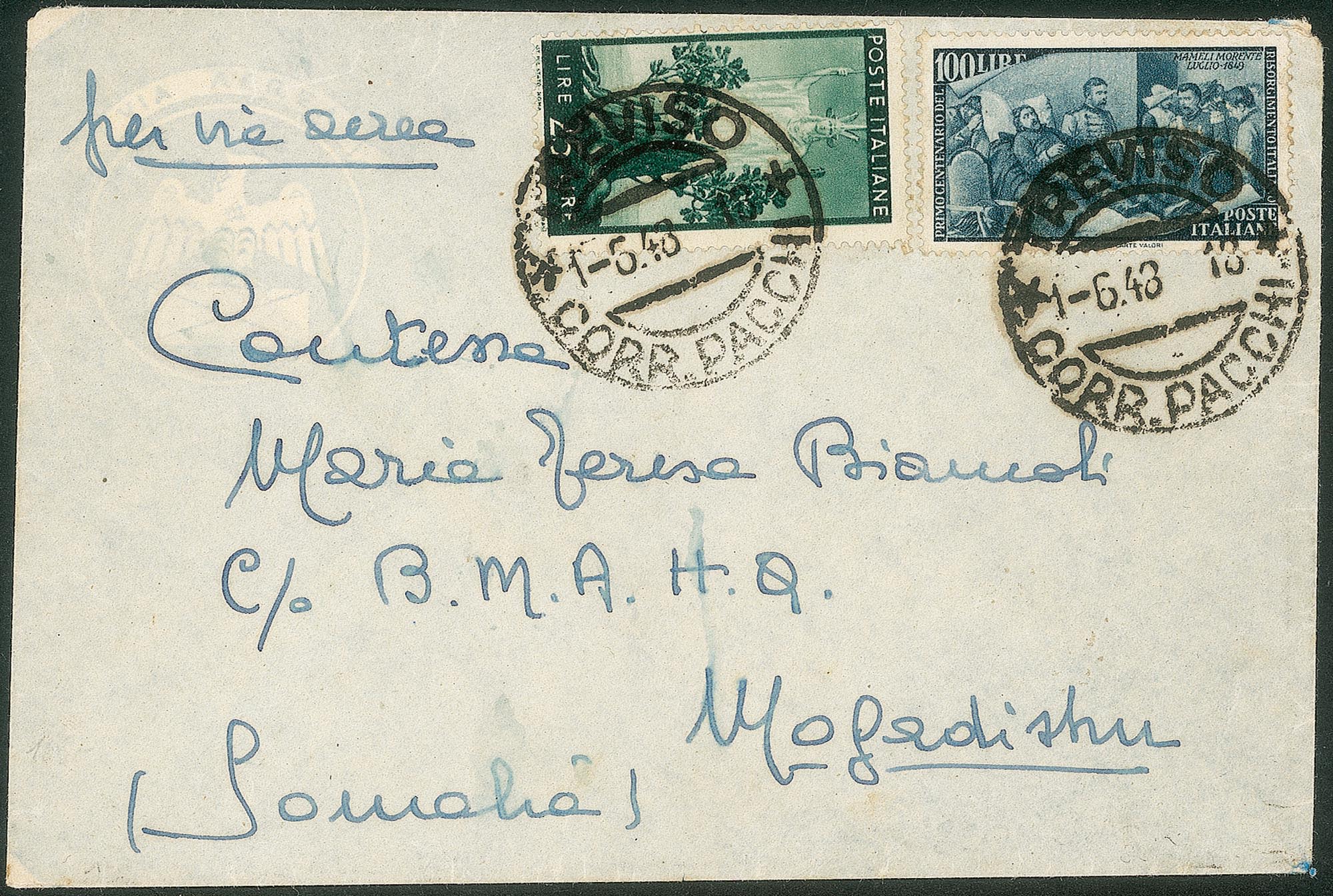 Italia - Repubblica - Risorgimento 100 lire (591) + 25 lire Democratica (562) su aerogrammaDa Treviso a Mogadiscio del 1.6.48 - rara destinazione