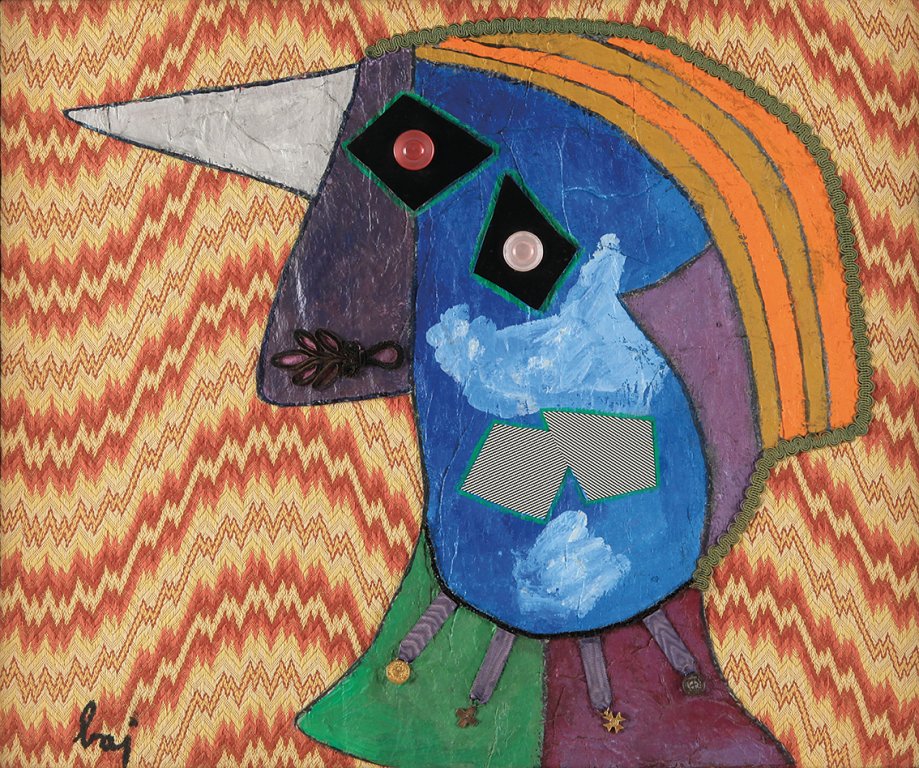 ENRICO BAJ (1924-2003) Testa 1968olio e collage su stoffa cm 54,4x65,5firmato...