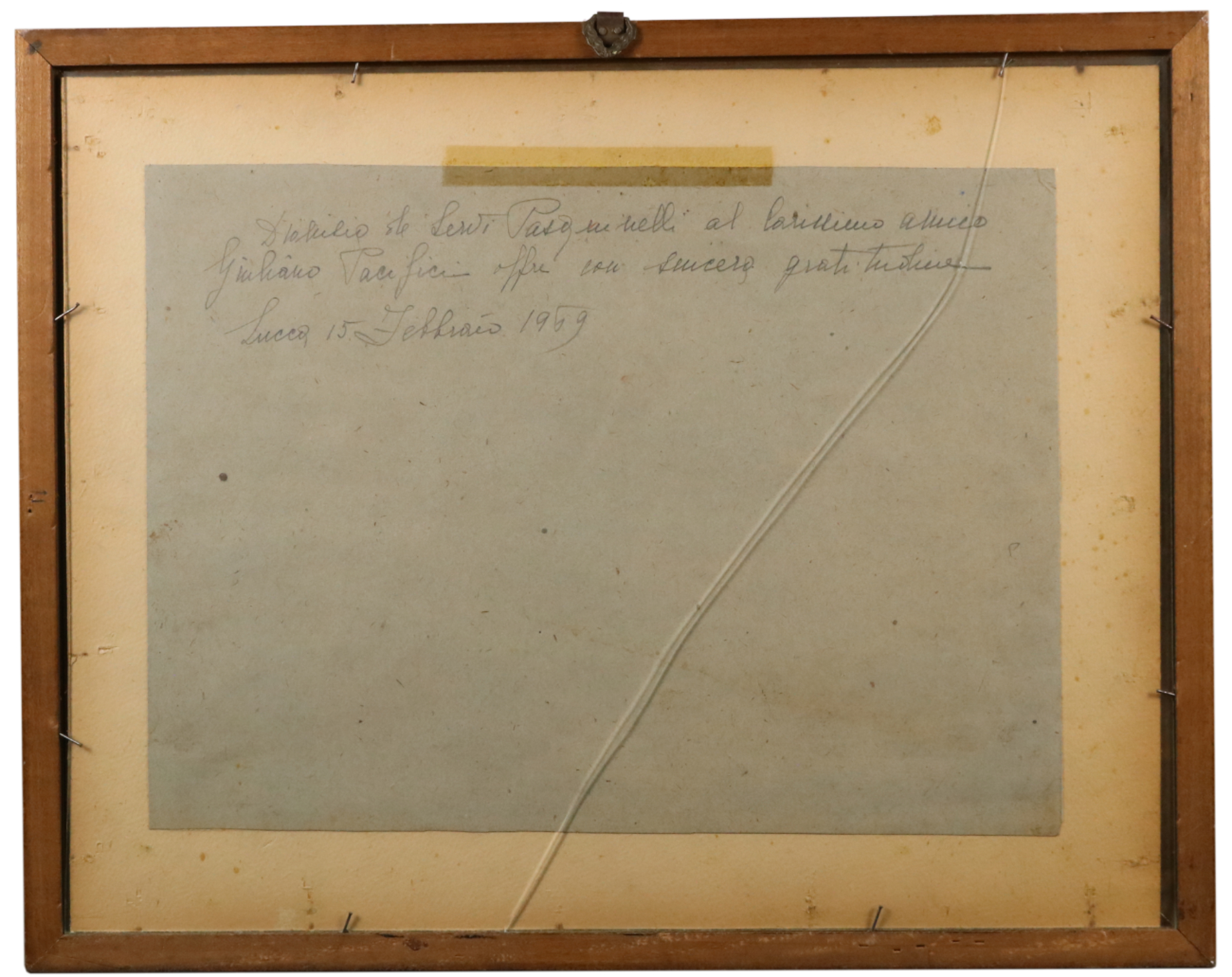 Sul verso: "(...) de Servi Pasquinelli al Carissimo amico Giuliano Pacifici offre con sincera gratitudine, Lucca 15 febbraio 1969"