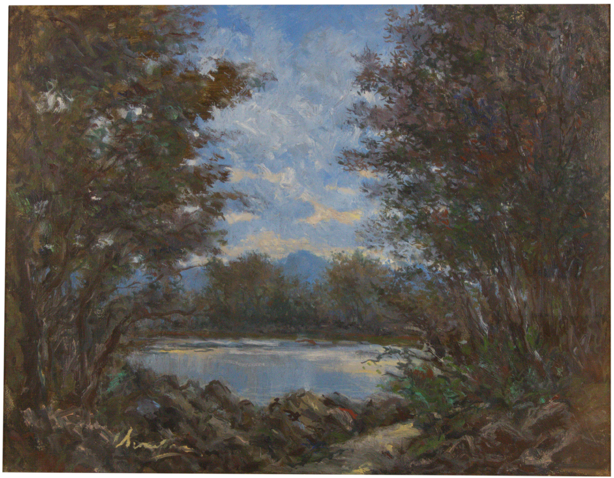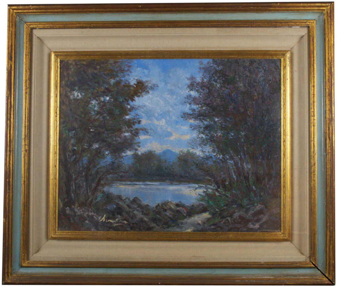 Cesare Scomparin (Venezia, 1915 - Pisa, 1976) Paesaggio sul lago Olio su...