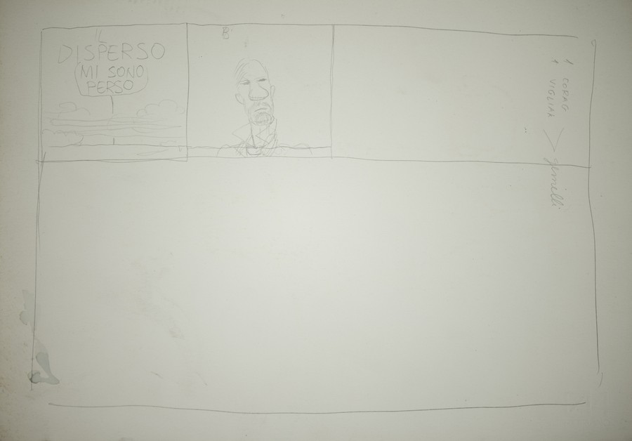 PAZIENZA ANDREA Il disperso da "Il Male". 1979. Matita su cartoncino. Cm 34,00 x 24,00. Firma al retro