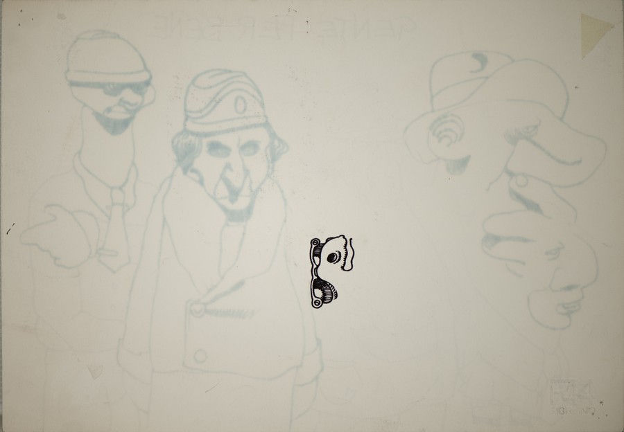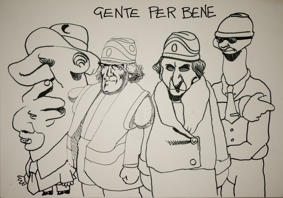 TANINO LIBERATORE - FILIPPO SCOZZARI- ANDREA PAZIENZA Gente per bene. 1979. pennarello su carta. Cm 34,00 x 24,00. Disegno a quattro mani di Liberatore e Scozzari sul fronte, disegno incompleto di Pazienza sul retro.