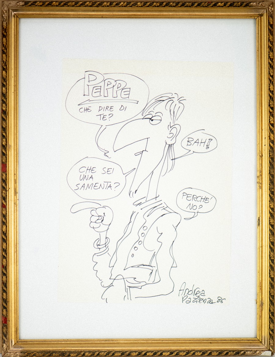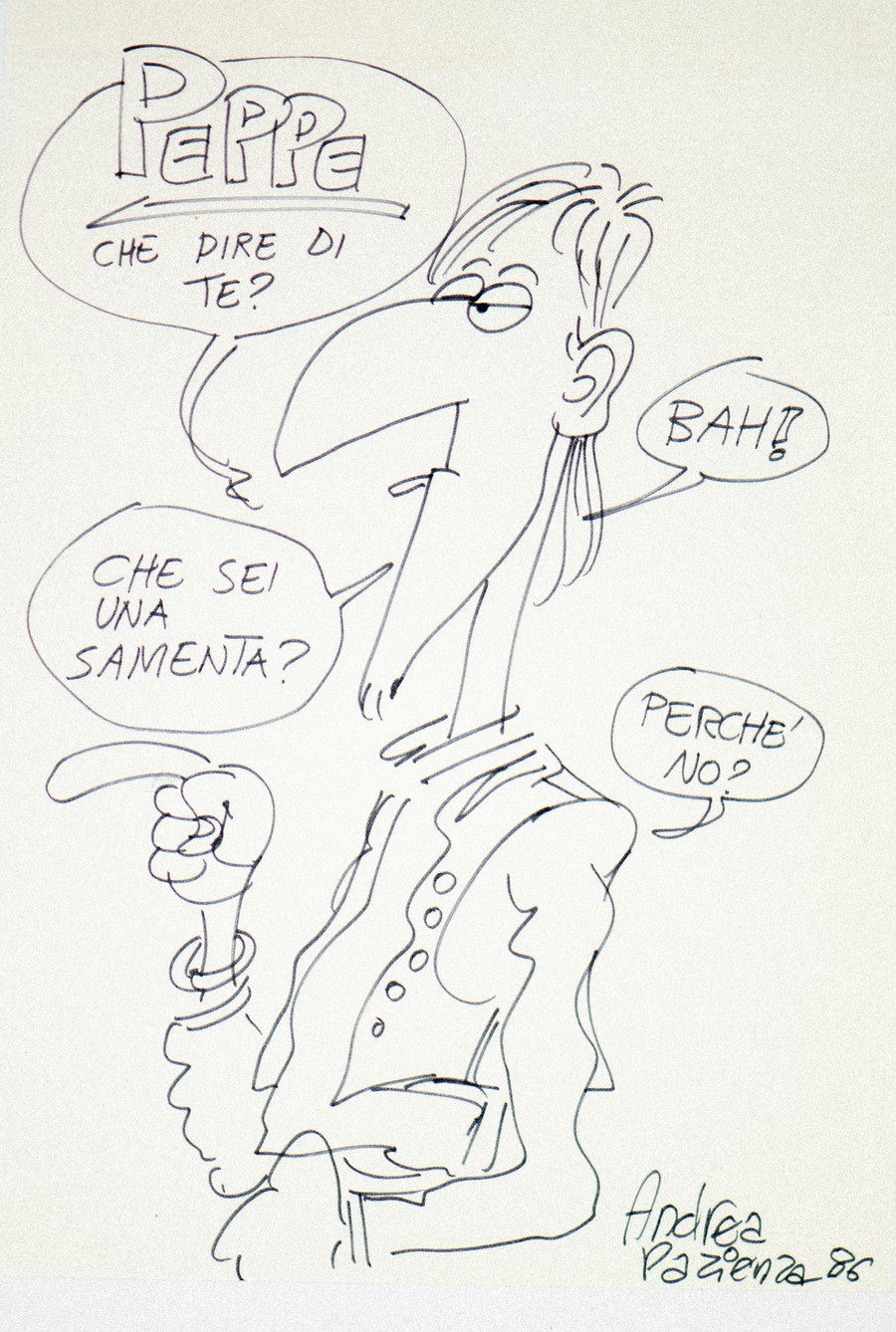 PAZIENZA ANDREA Peppe che dire di te?. 1986. pennarello su carta. Cm 21,00 x 30,00. Firma e anno in basso a dx