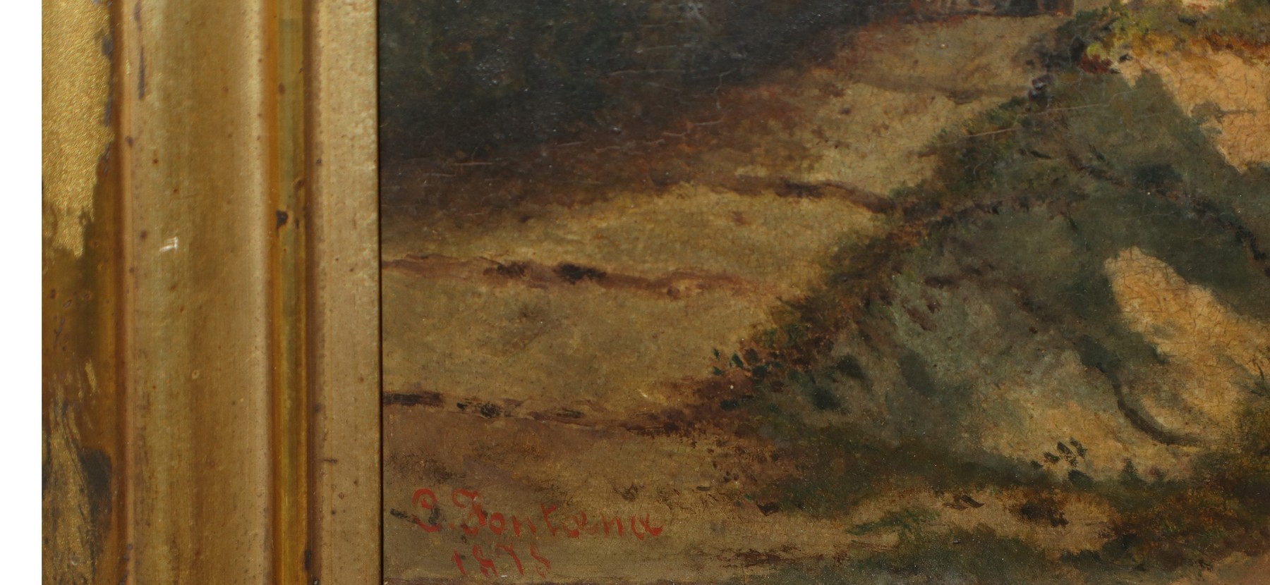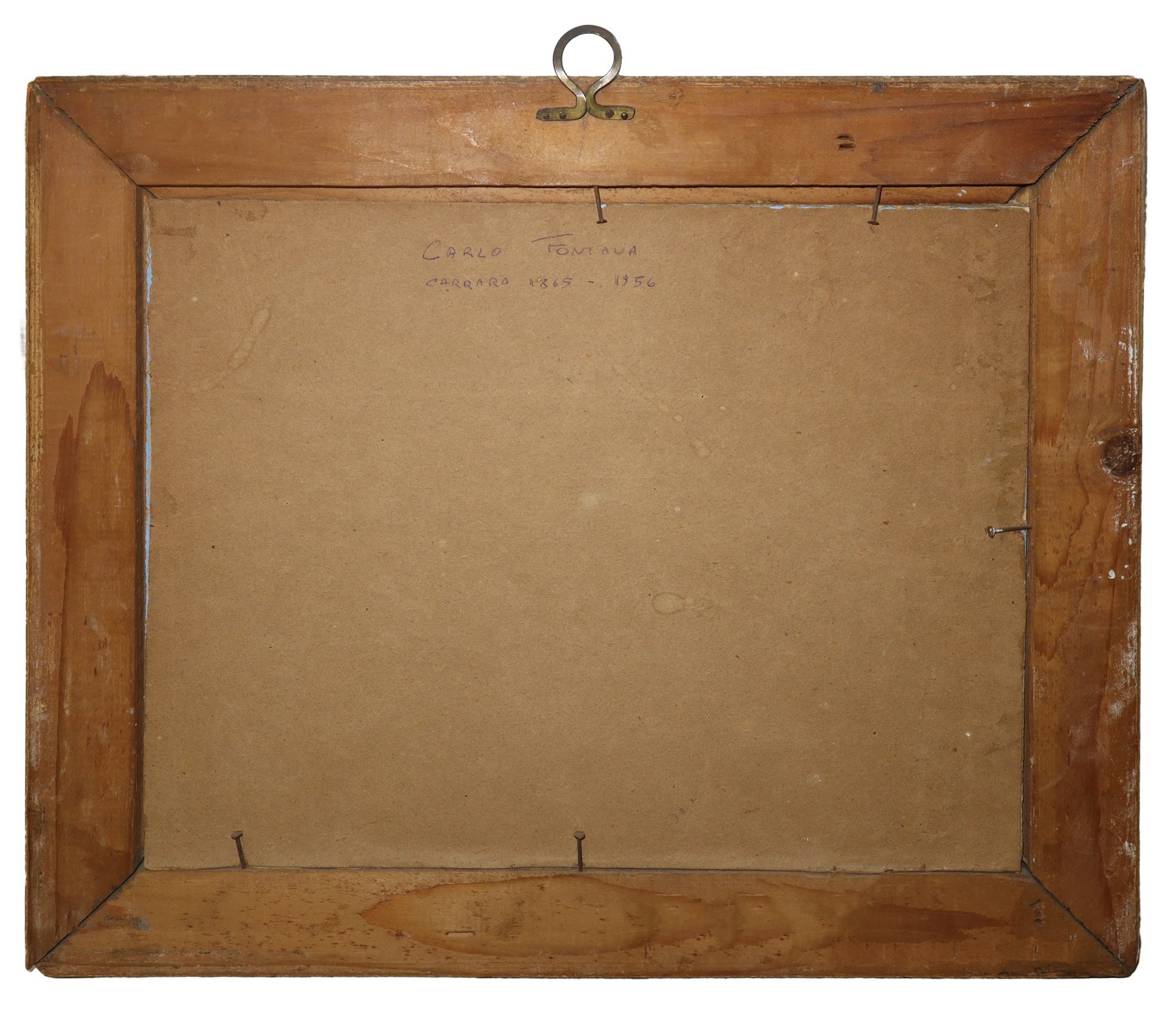 Carlo Fontana (Carrara 1865 - Sarzana 1956) - Paesaggio con piccola chiesa sul mare, 1895 h cm 25,5X33 in cornice h cm 36X42 olio su tavola