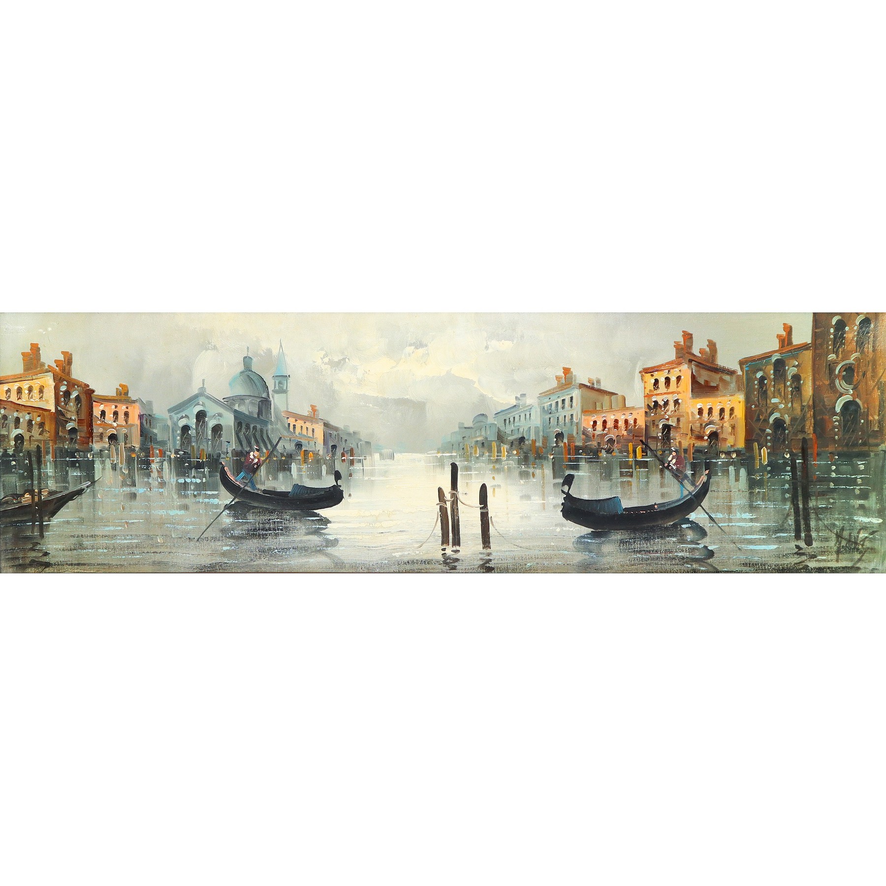 Canal Grande di Venezia con gondole, primi 20° secolo oil on canvas h cm 26X80 in cornice h cm 52X106 Firmato in basso a destra