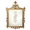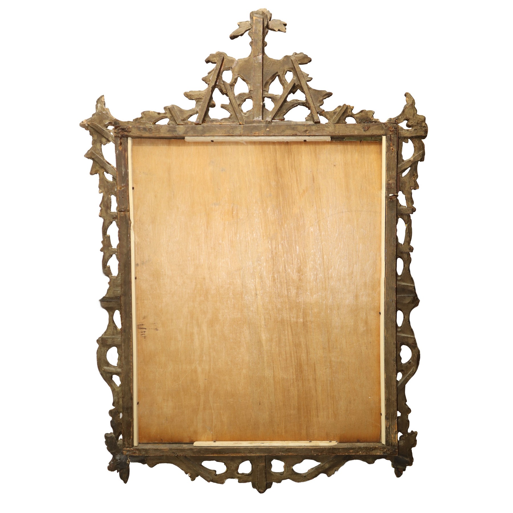 Specchiera veneziana in cornice dorata a foglia con specchio al mercurio bulinato con personaggio carnascialesco al centro, Venice 18° secolo h cm 72X60 incollatura alla cimasa