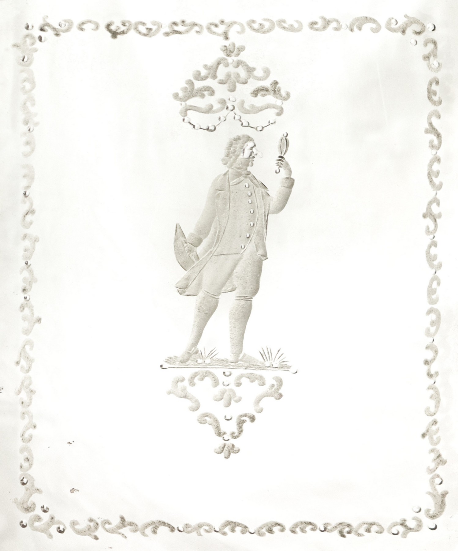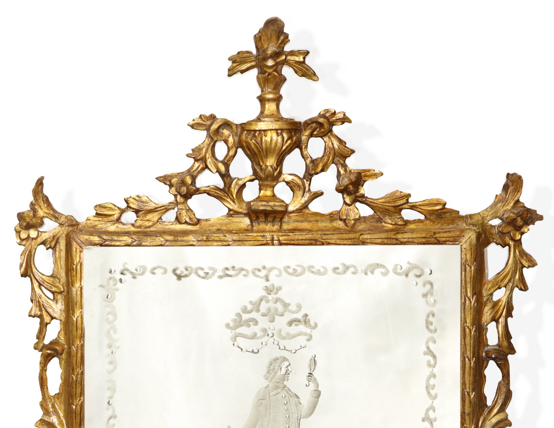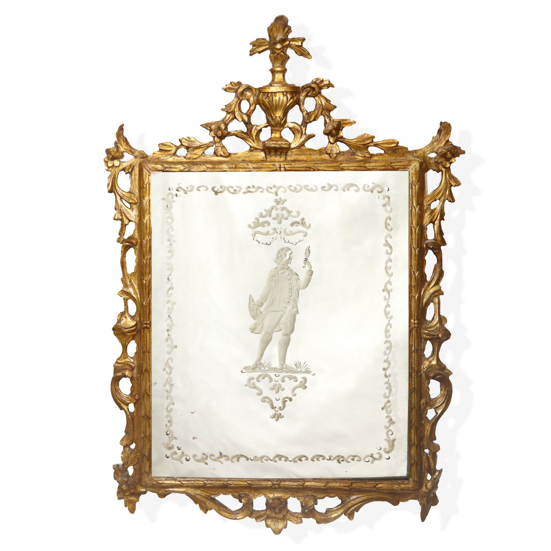 Lot 118 | Specchiera veneziana in cornice dorata a foglia con specchio al mercurio bulinato con personaggio carnascialesco al centro, Venice 18° secolo