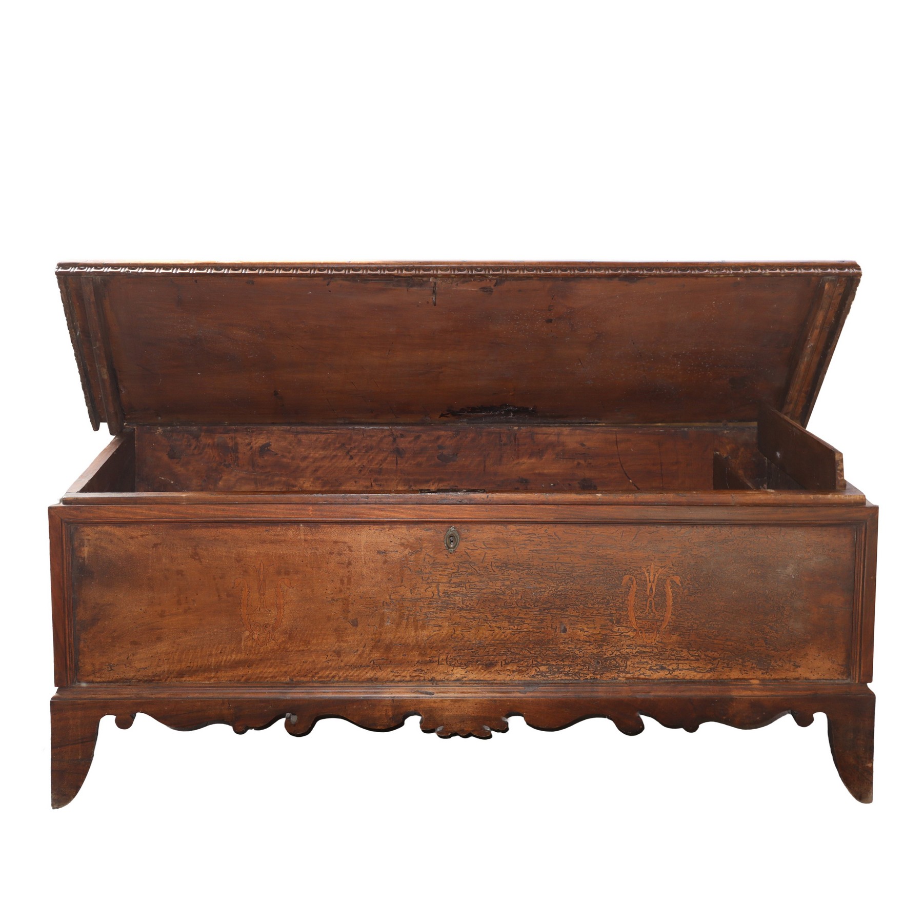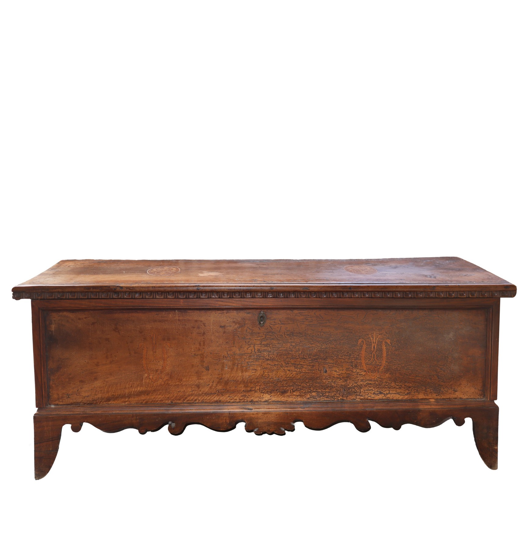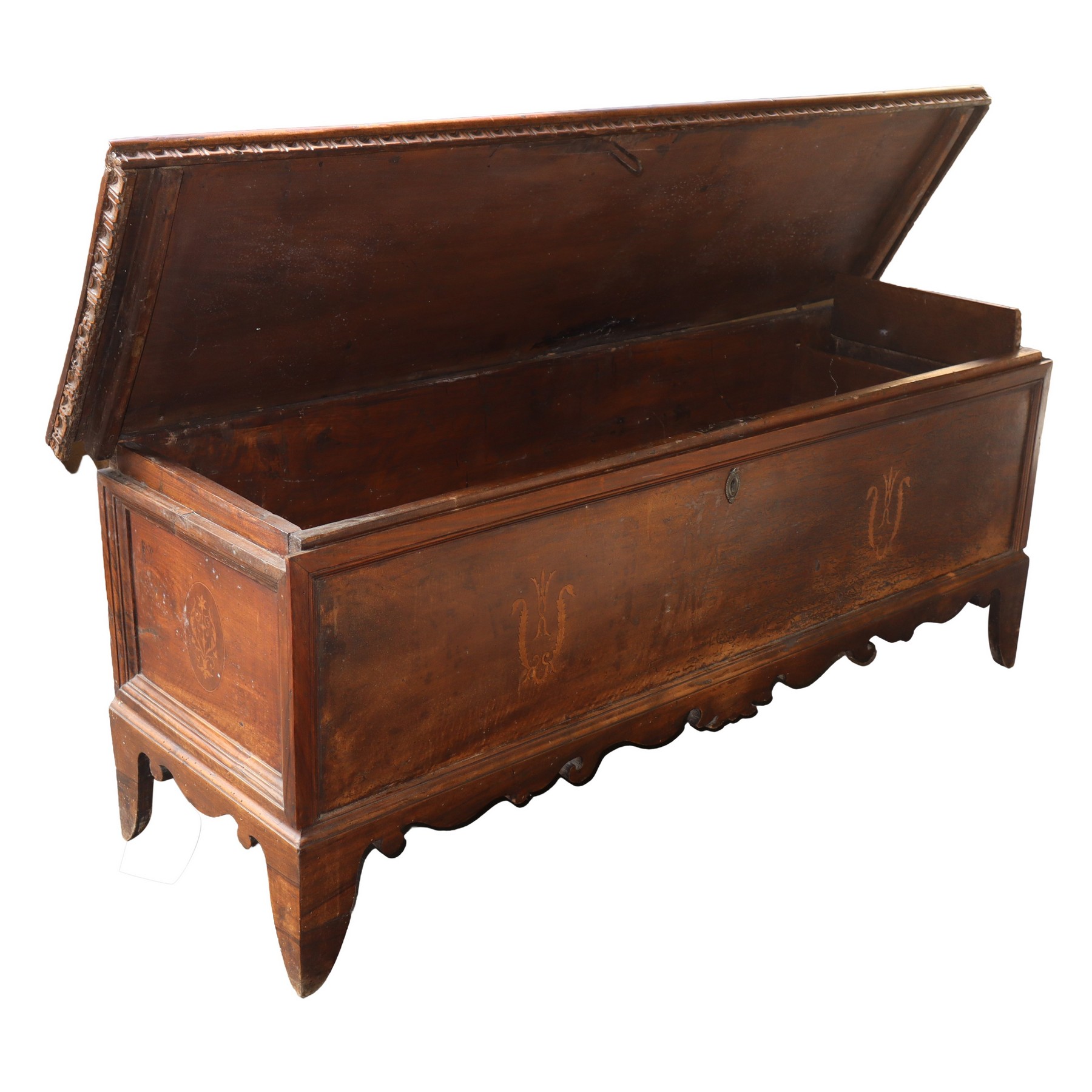 Cassapanca in noce H cm 46x158x61 Intarsi sul fronte sui lati e sul piano. Dentellatura sottocoperchio, mantovana sagomata. Segni del tempo.