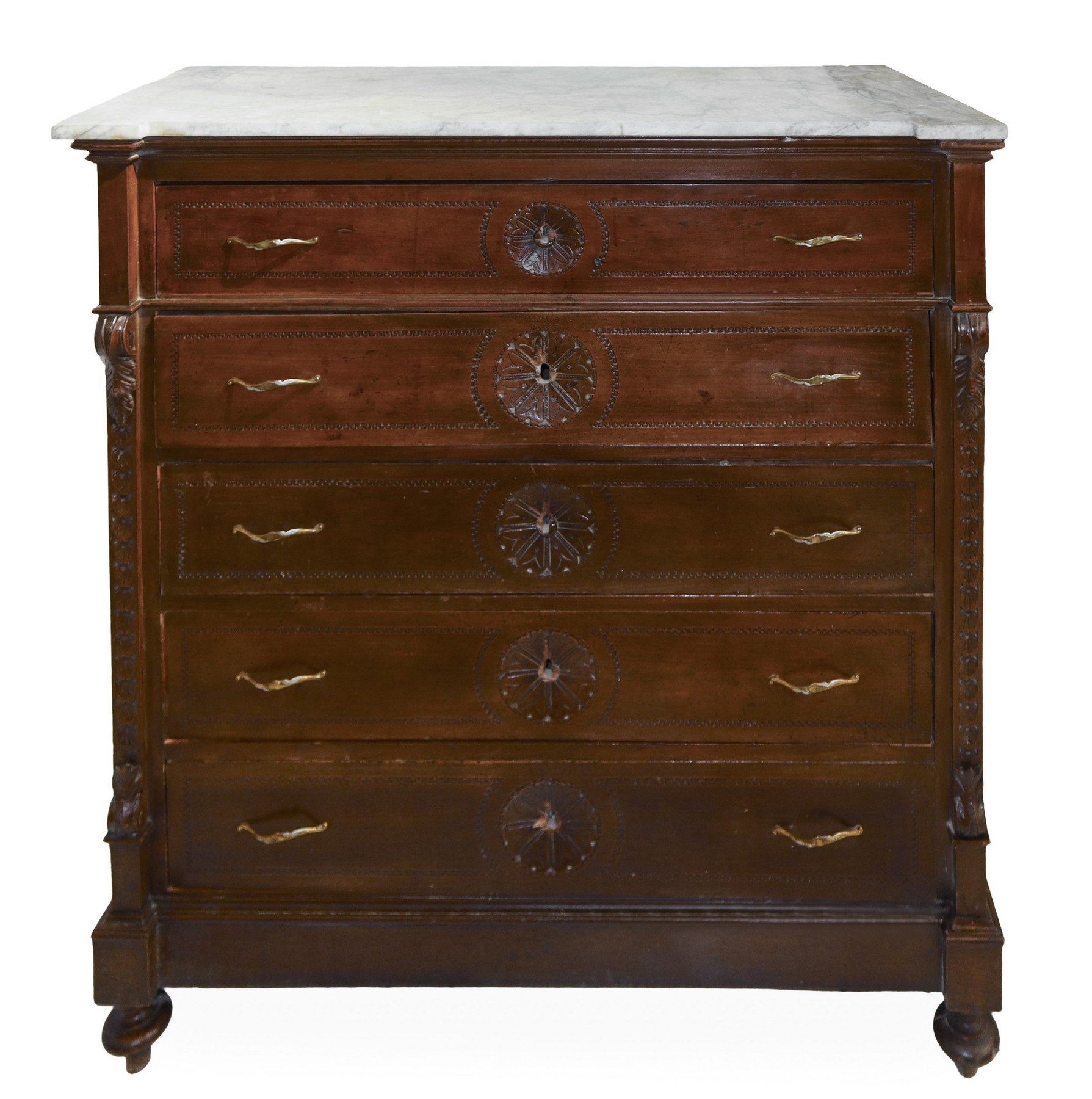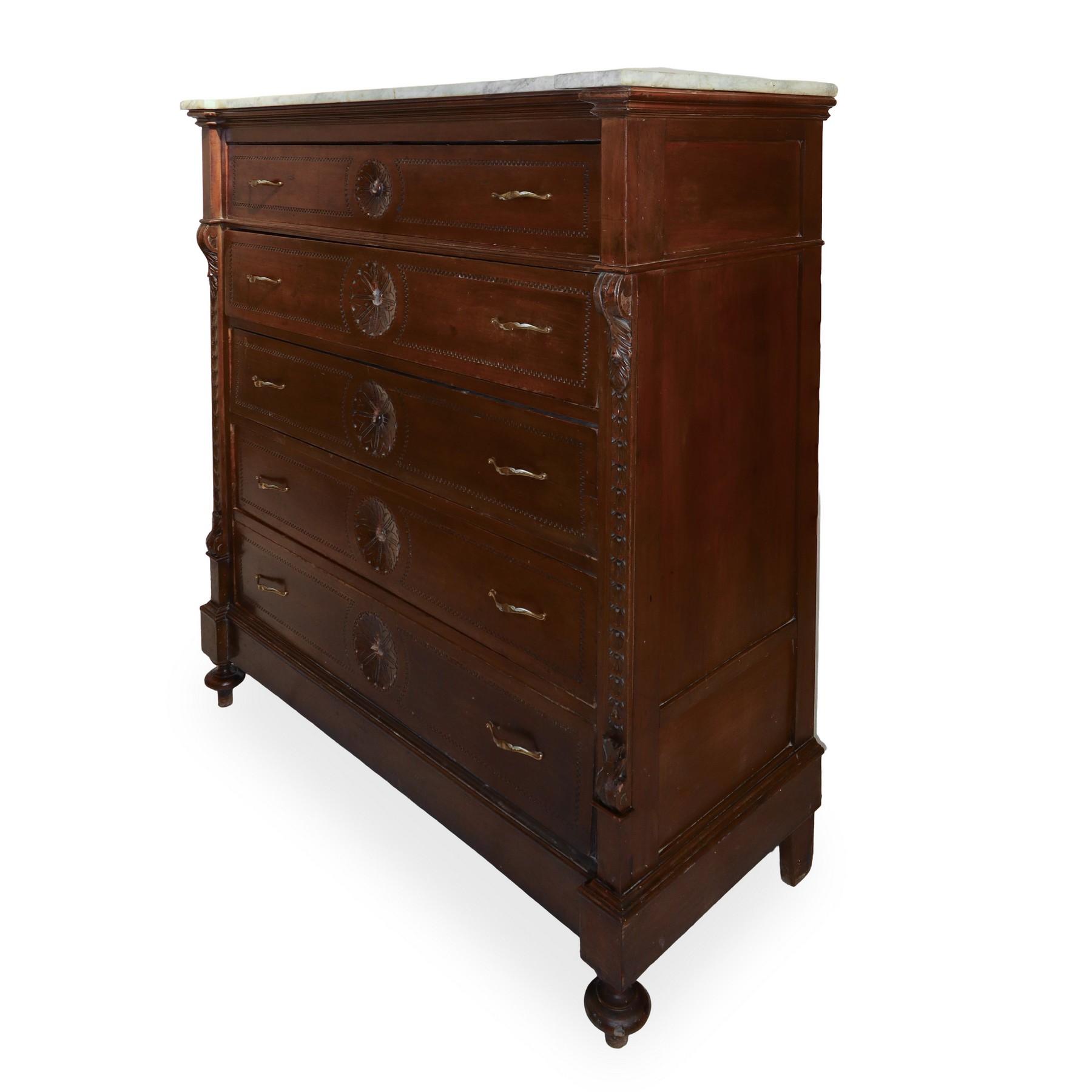 Cassettone a 5 cassetti marmo bianco carrara al piano bocchette intagliate a rosone h cm 128X120X51