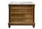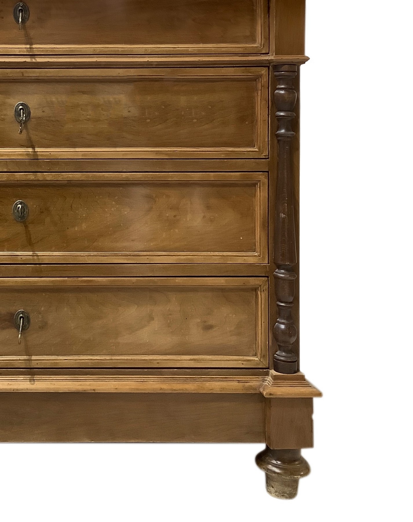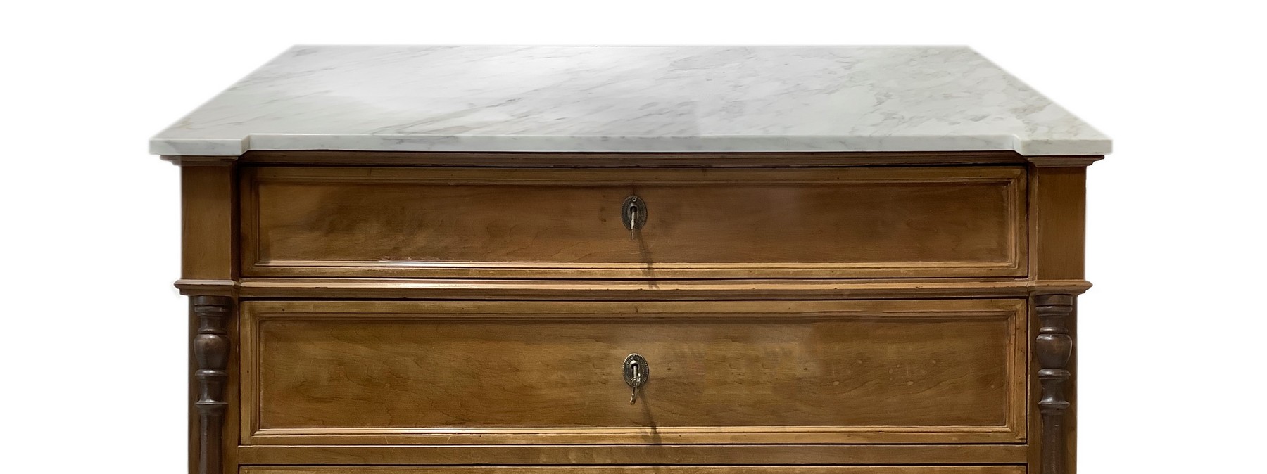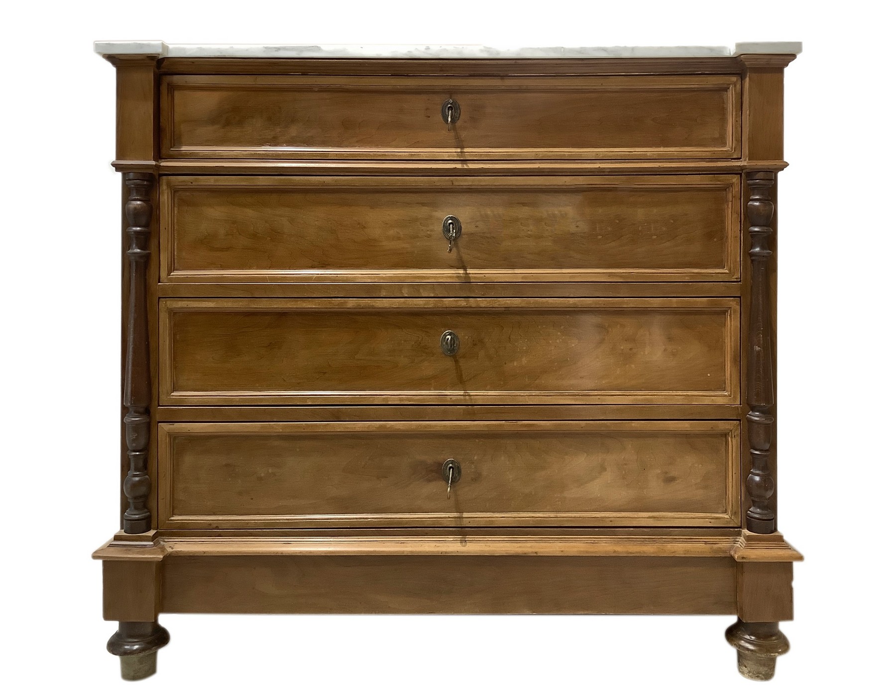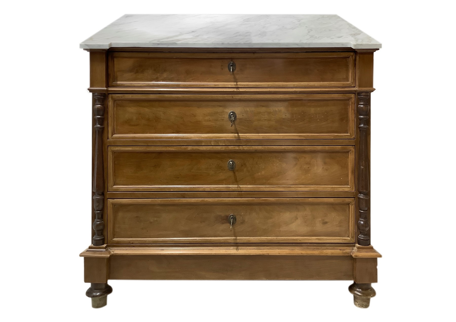 Cassettone a quattro cassetti in legno di noce con mezze colonne ai lati, piedi a cipolla e marmo bianco al piano