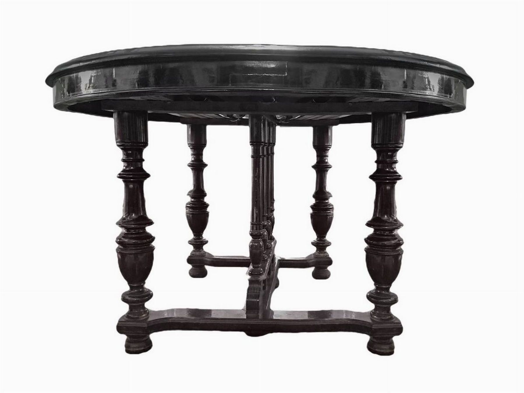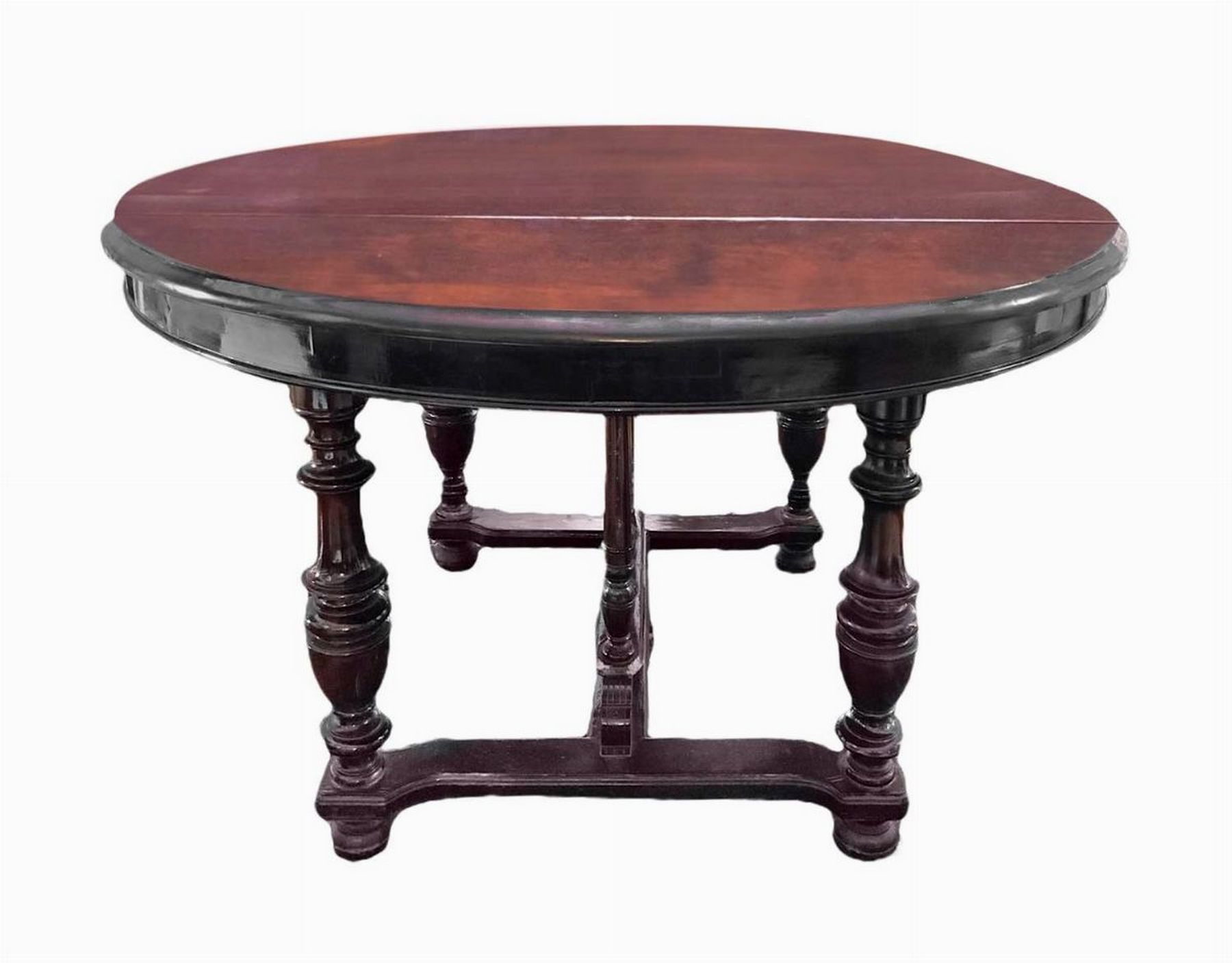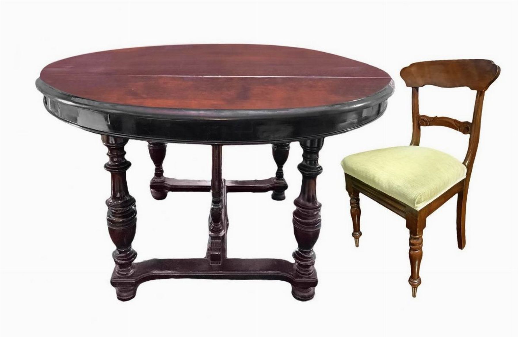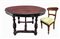 Tavolo rotondo in mogano allungabile con quattro sedie e allunghi di servizio
