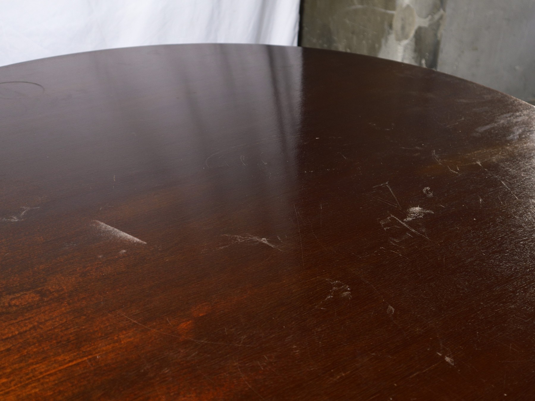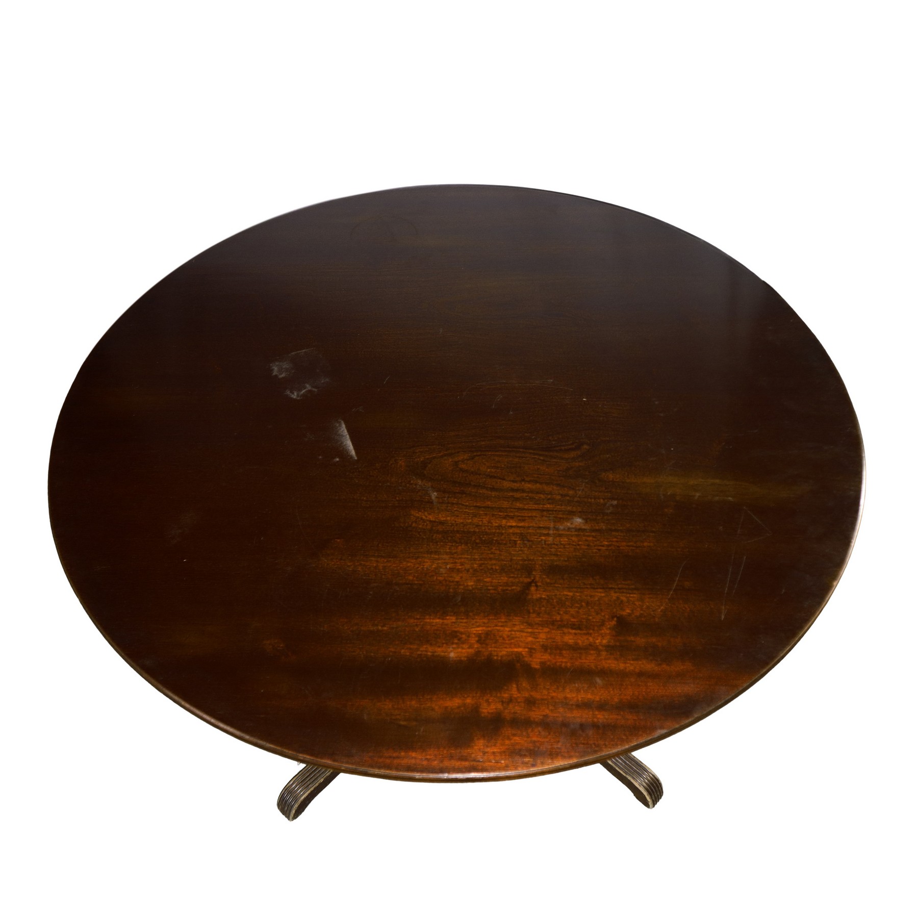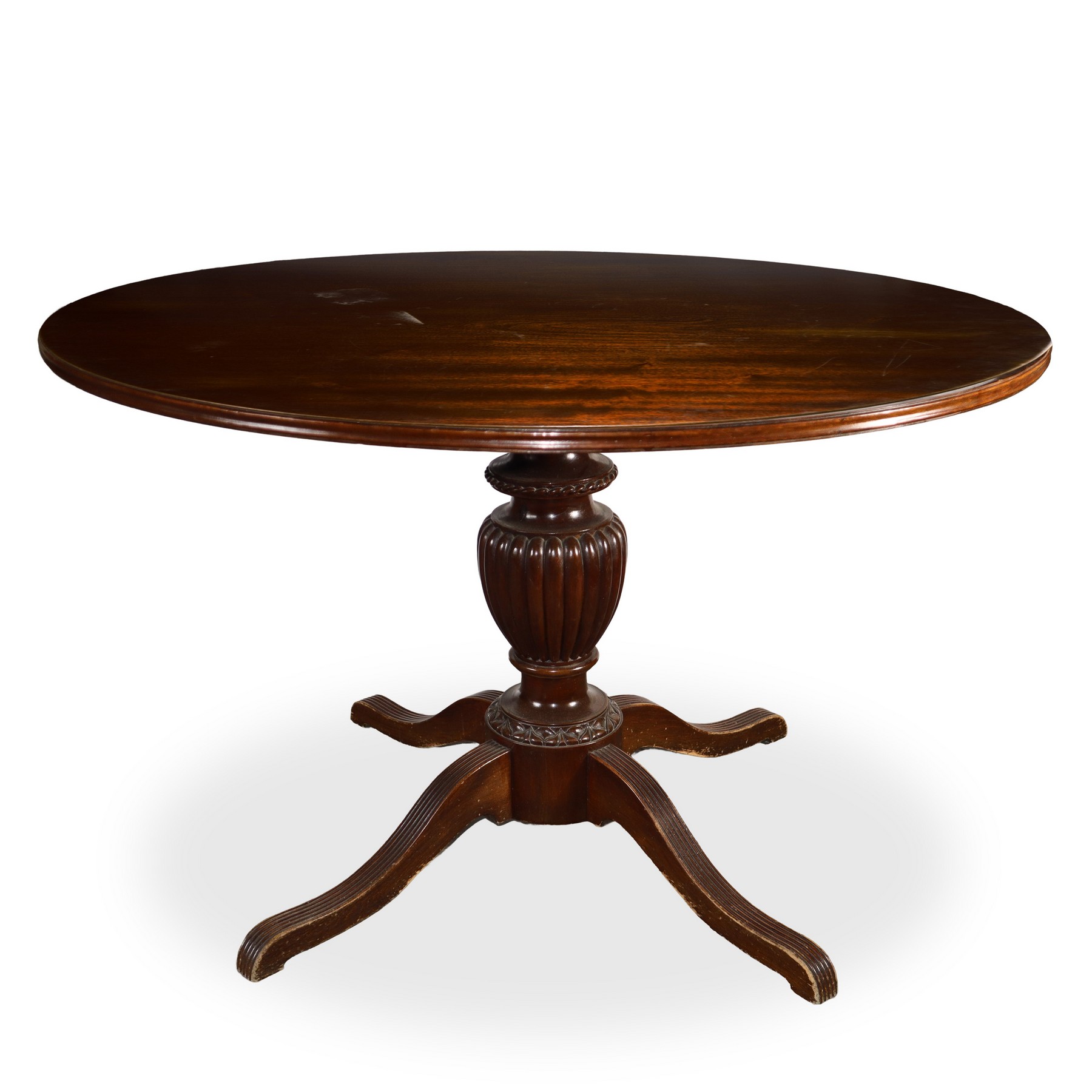 Tavolo con piede a 4 razze e piano rotondo con sostegno globulare in legno, primi 20° secolo Hcm 77 x D 120 Segni sul piano.Segni sul piano.
