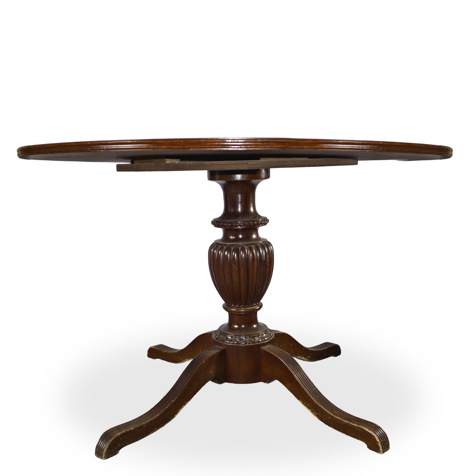 Tavolo con piede a 4 razze e piano rotondo con sostegno globulare in legno, primi 20° secolo