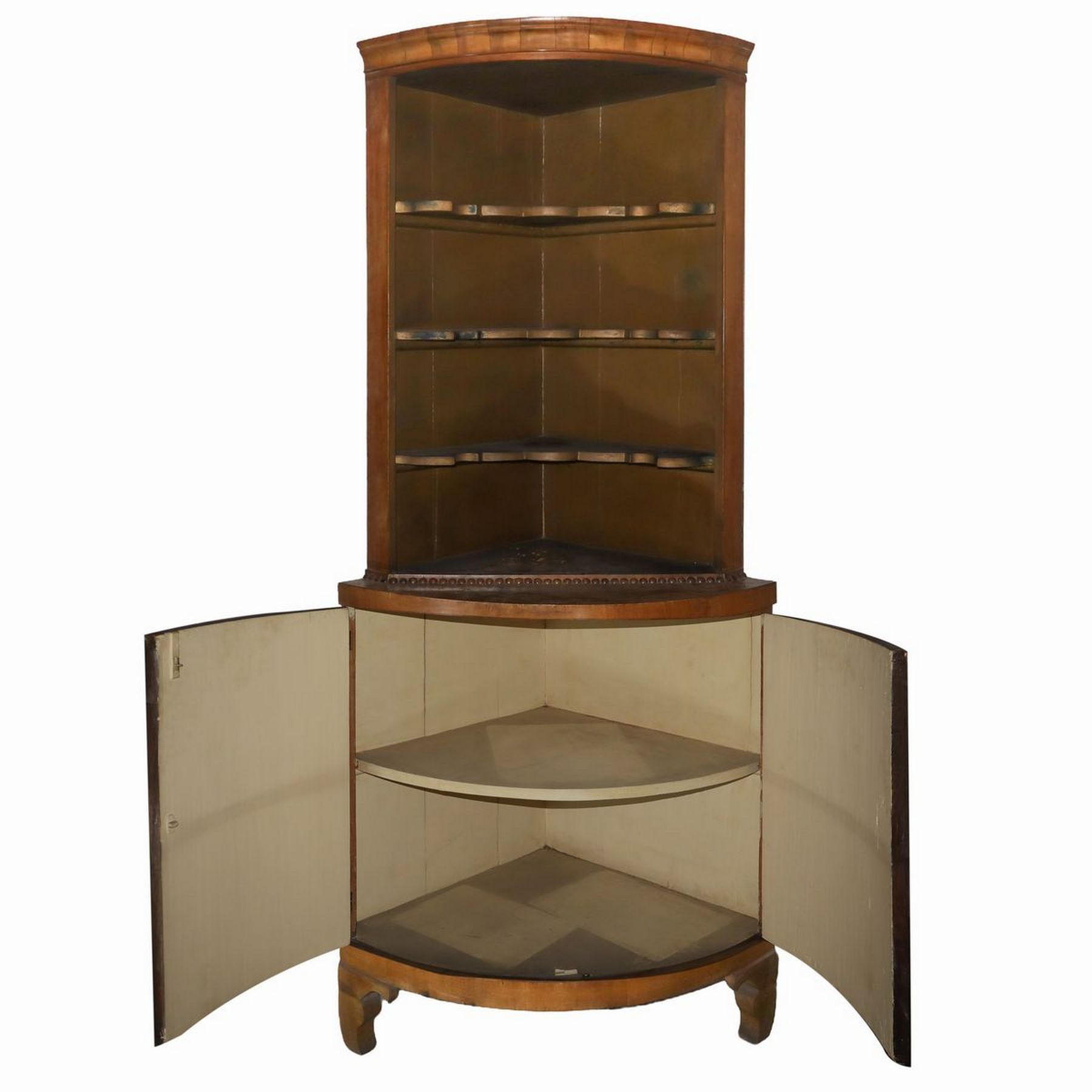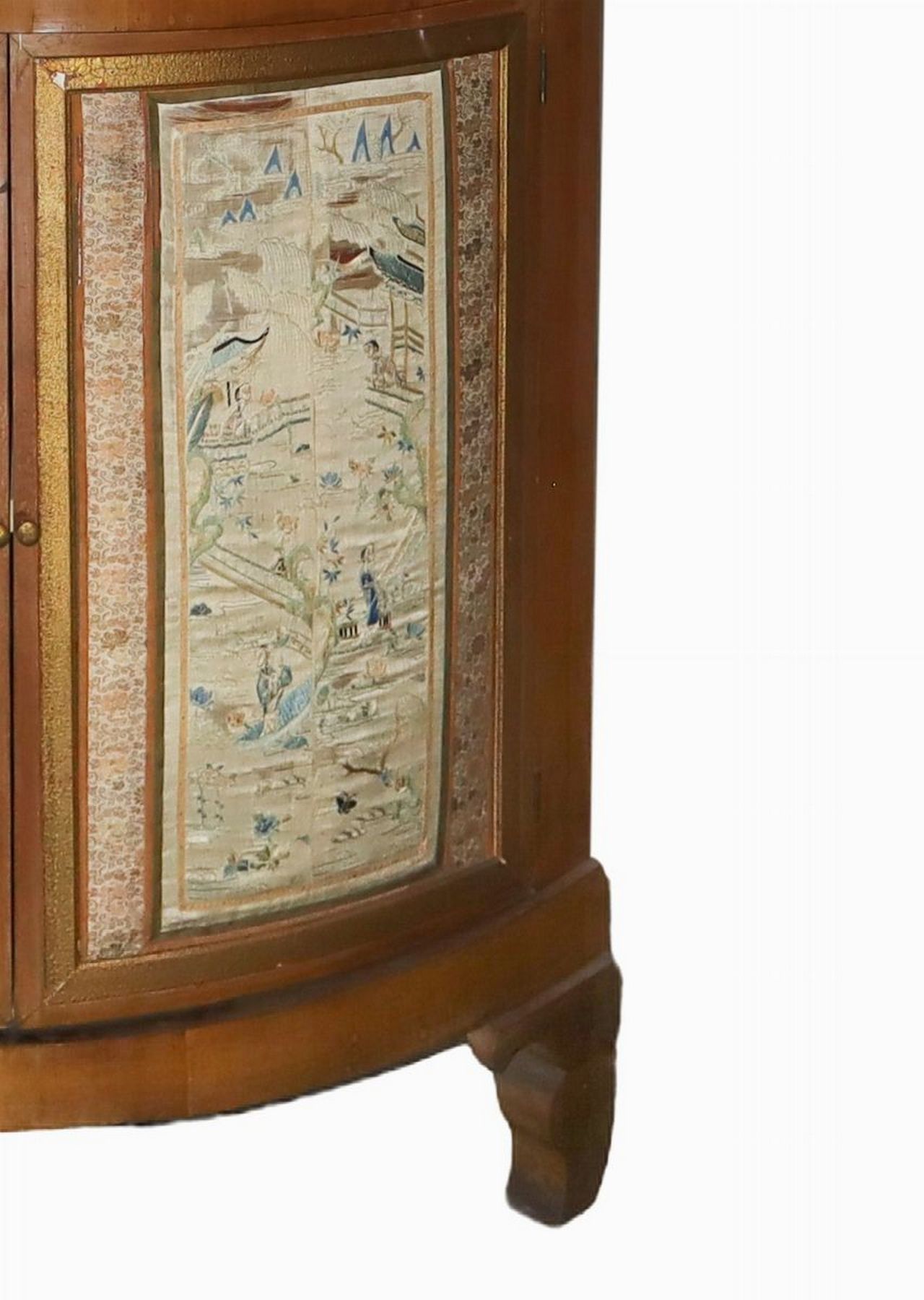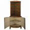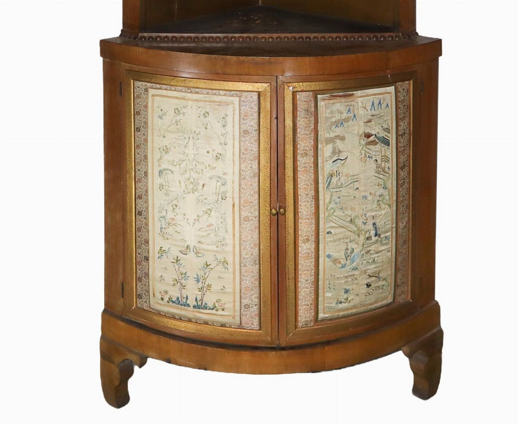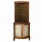 Angoliera h cm 195 x 86 x 60 A corpo unico con mensoleria in alto e sportelli bombati e foderati in stoffa, cornice superiore in legno di traverso A corpo unico con mensoleria in alto e sportelli bombati e foderati in stoffa, cornice superiore in legno di traverso