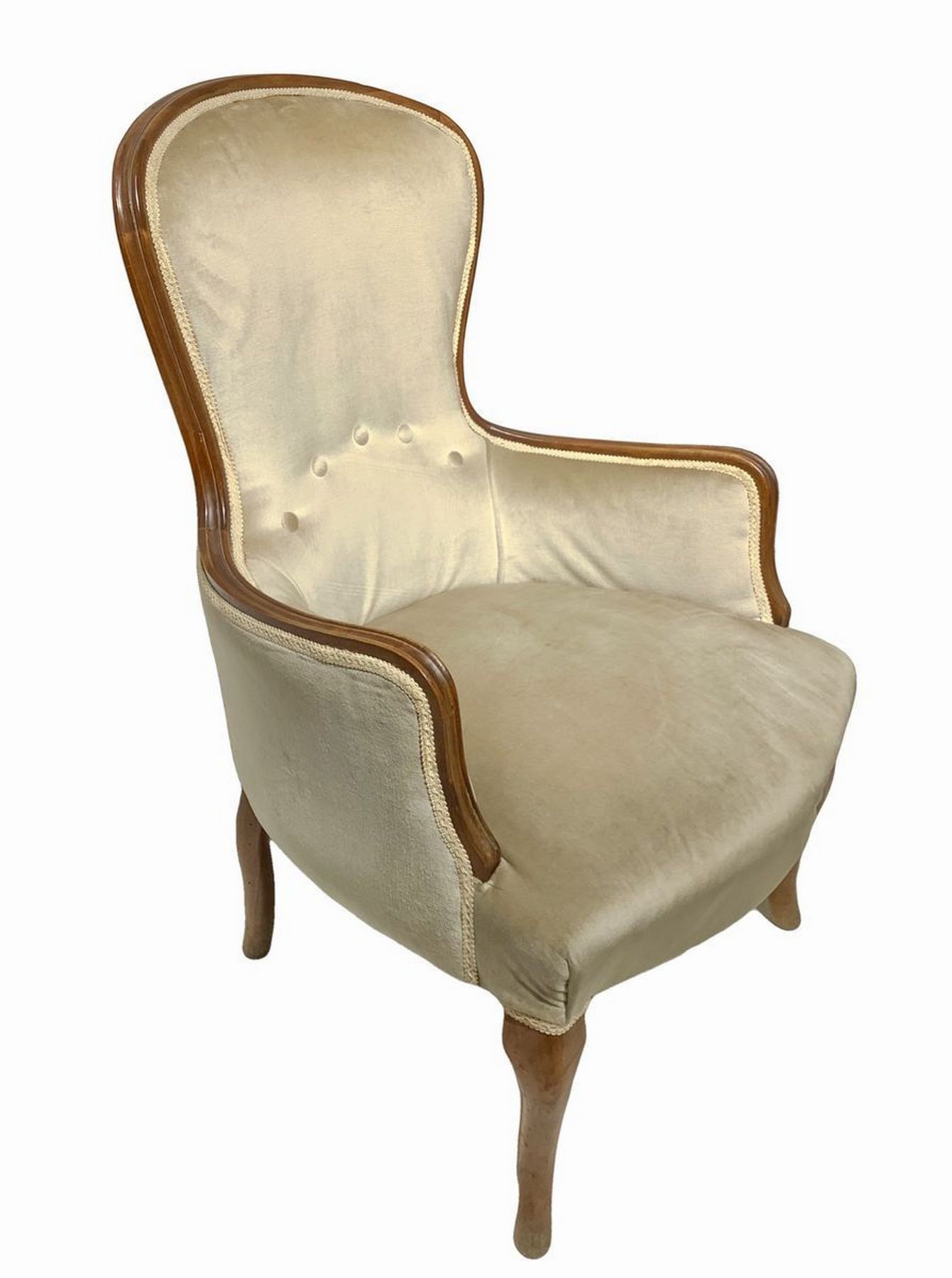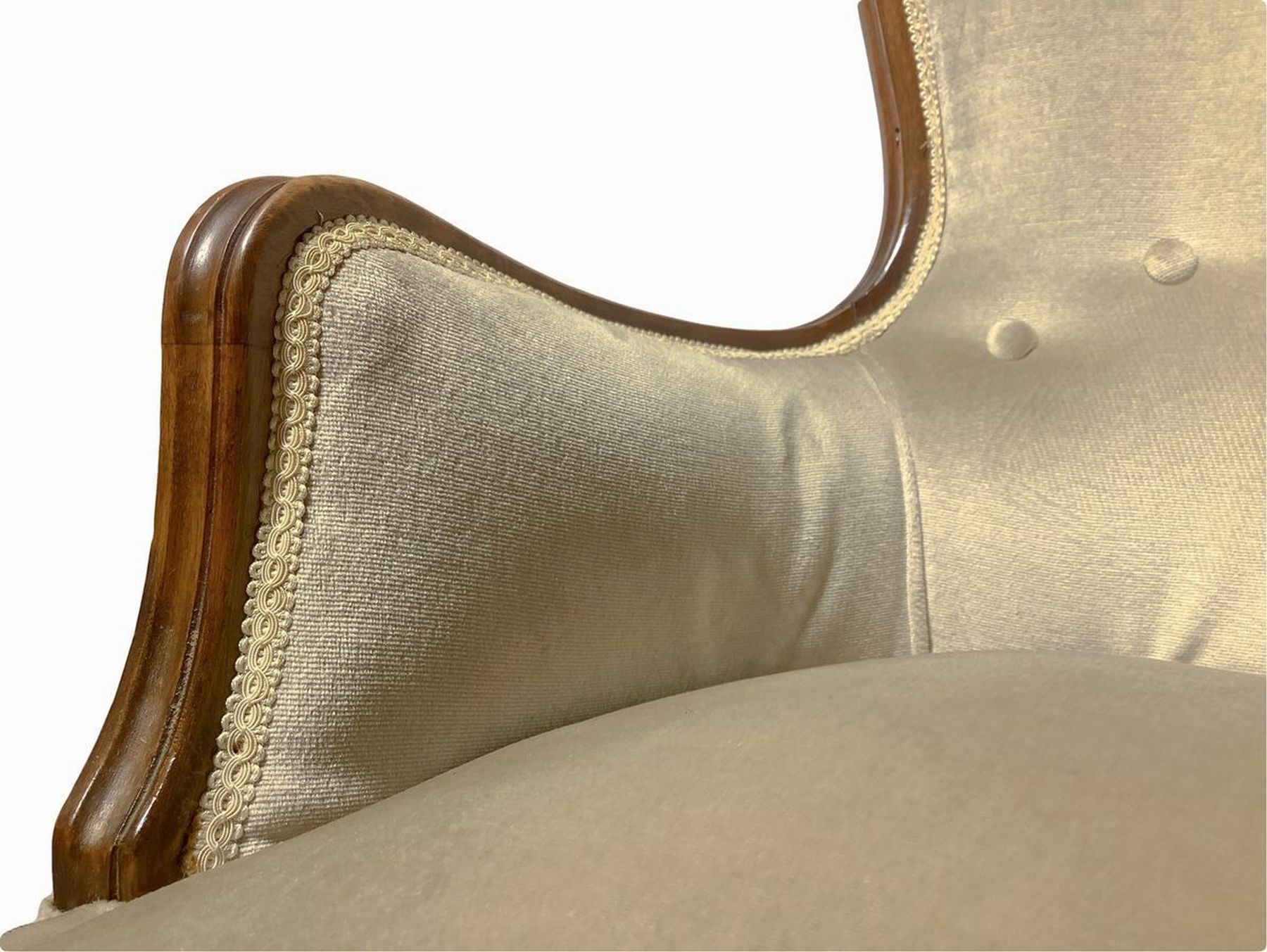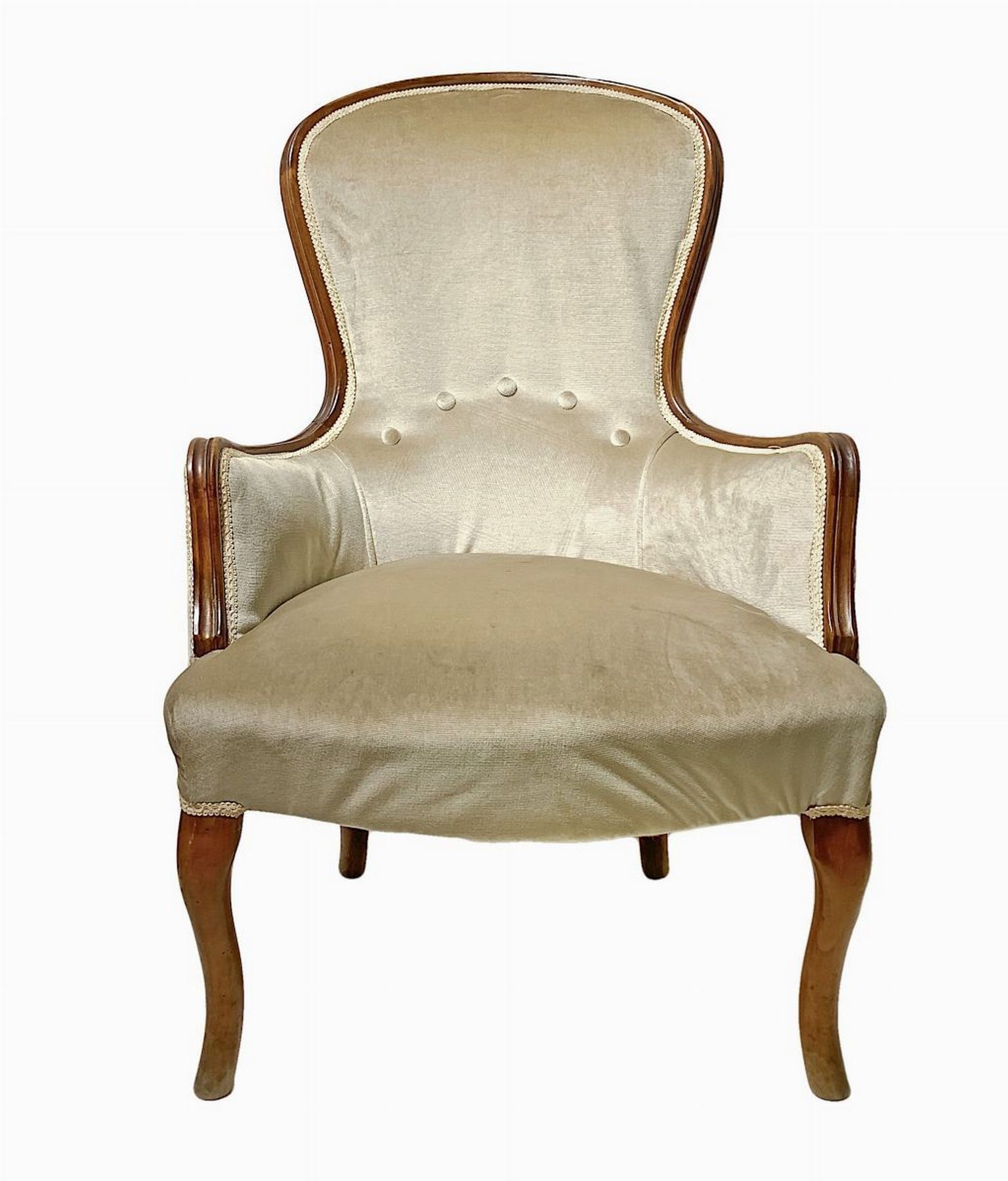 Salotto composto da divanetto e due poltrone, primi 20° secolo In stile Luigi Filippo, imbottitura a molle, tapezzeria in velluto beige, struttura in legno di noce chiara. Segni di usura.In stile Luigi Filippo, imbottitura a molle, tapezzeria in velluto beige, struttura in legno di noce chiara. Segni di usura.