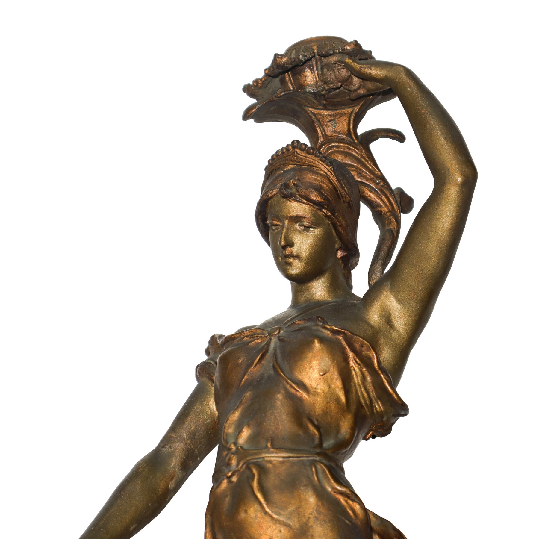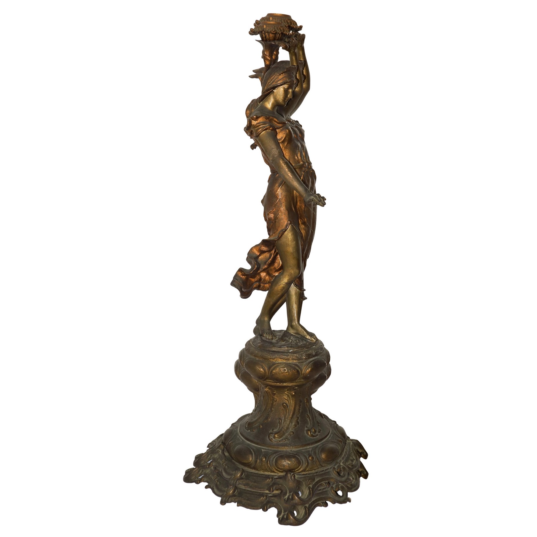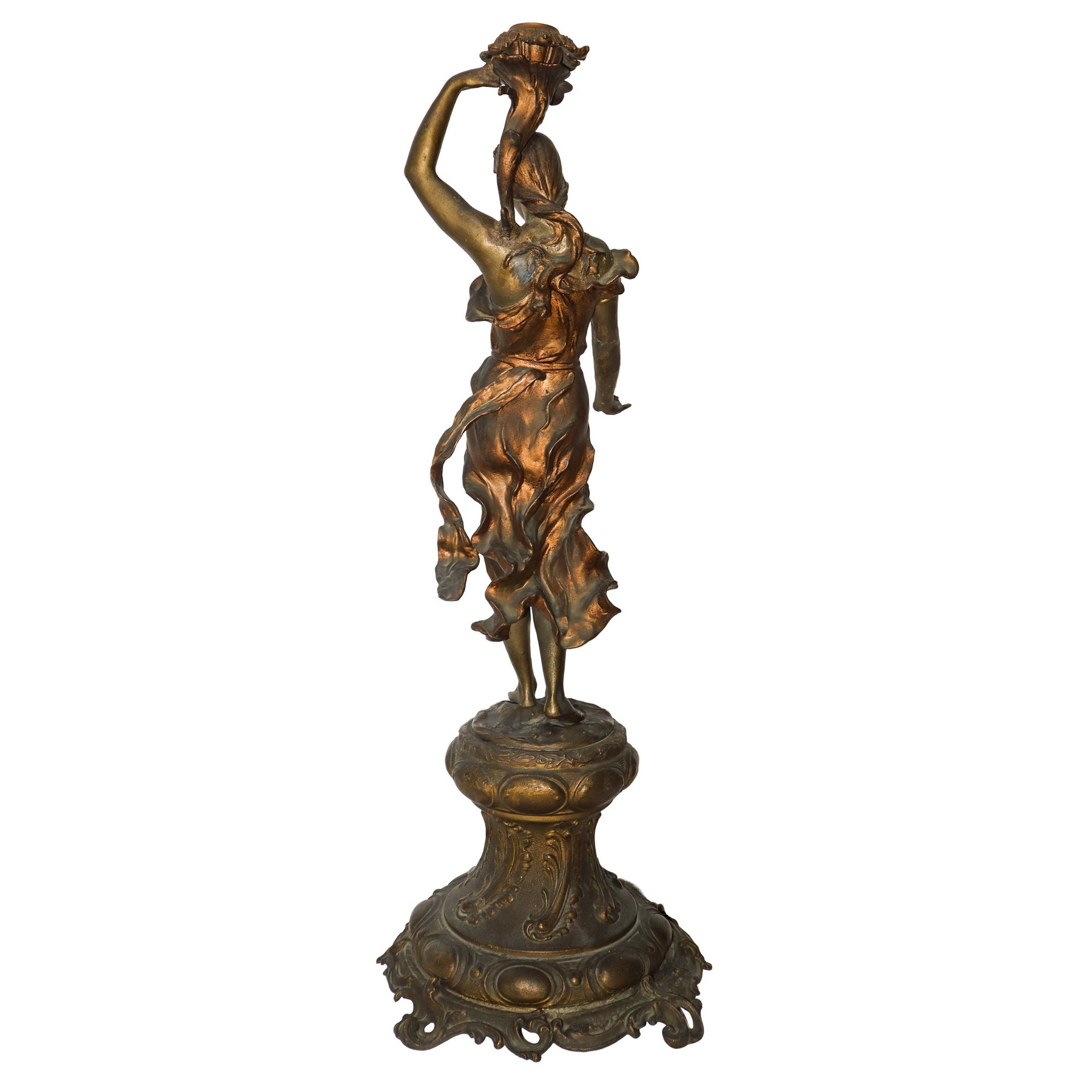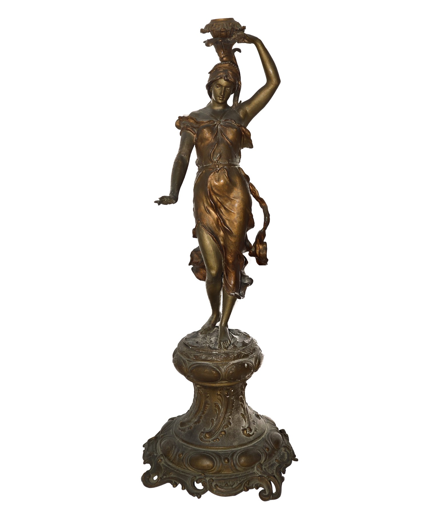 Scultura femminile portacandele in bronzo con piedistallo