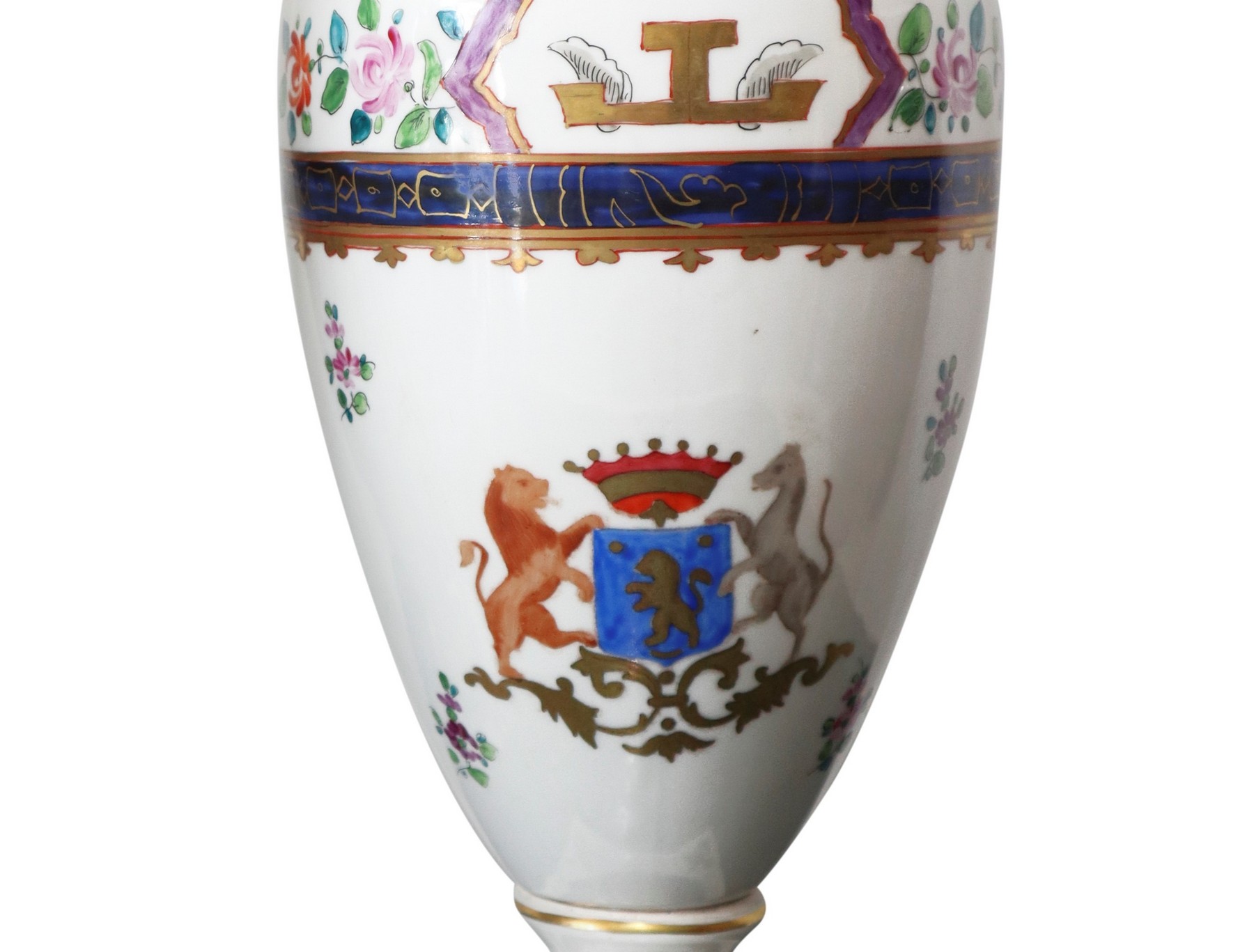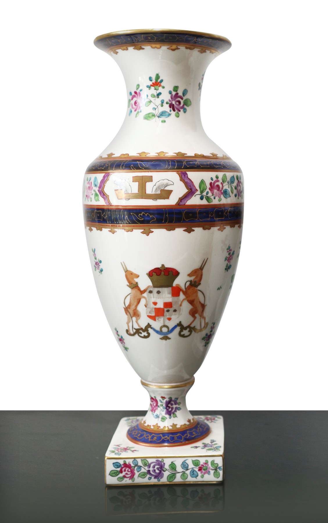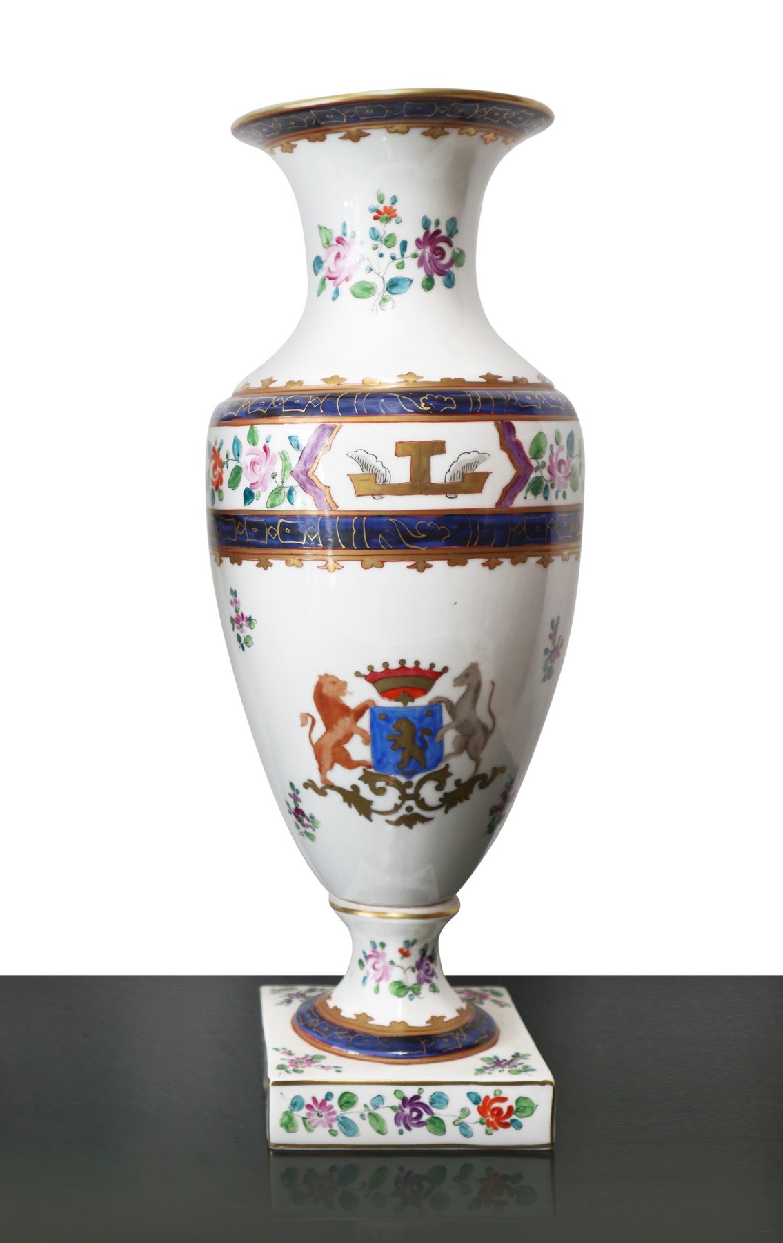 Dresden Porcelain - Coppia di vasi in porcellana h cm 34,5 di cui base cm 2; h cm 33,5 di cui base cm 2 Con rappresentazioni sul fronte di cani e stemmi, presenti decorazioni dorate e di fiori Con rappresentazioni sul fronte di cani e stemmi, presenti decorazioni dorate e di fiori
